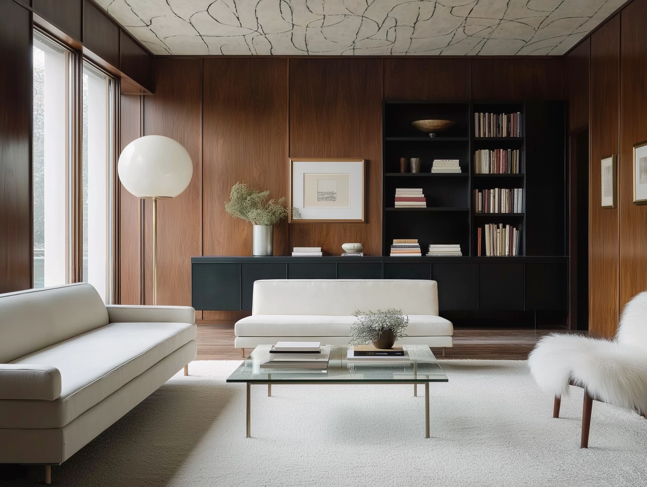Sculptural seating and black built-ins ground this walnut-wrapped workspace, where a painterly ceiling adds a note of artistic flair.