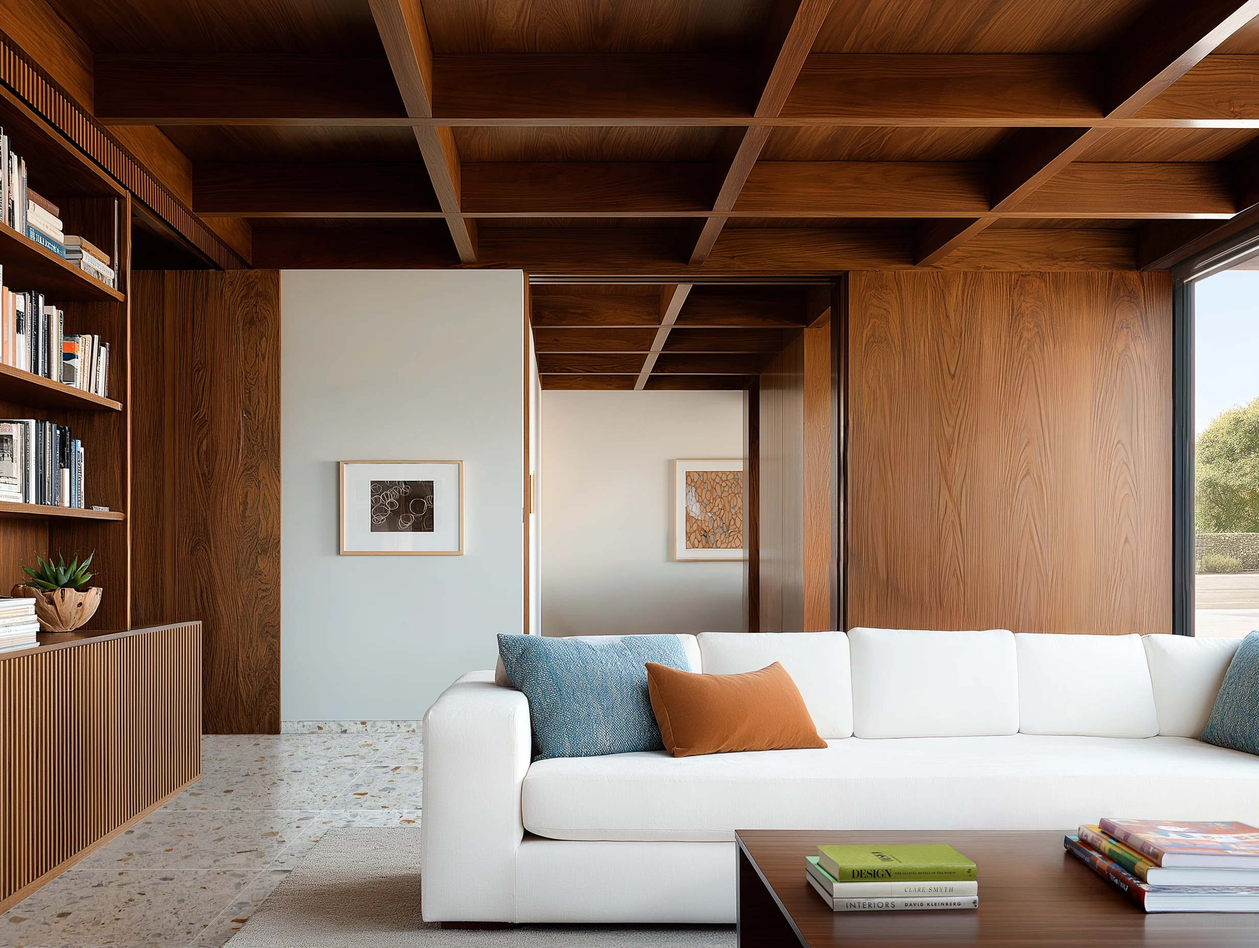 Clean-lined furniture plays against warm walnut paneling in this perfectly squared-off, midcentury-inspired moment.