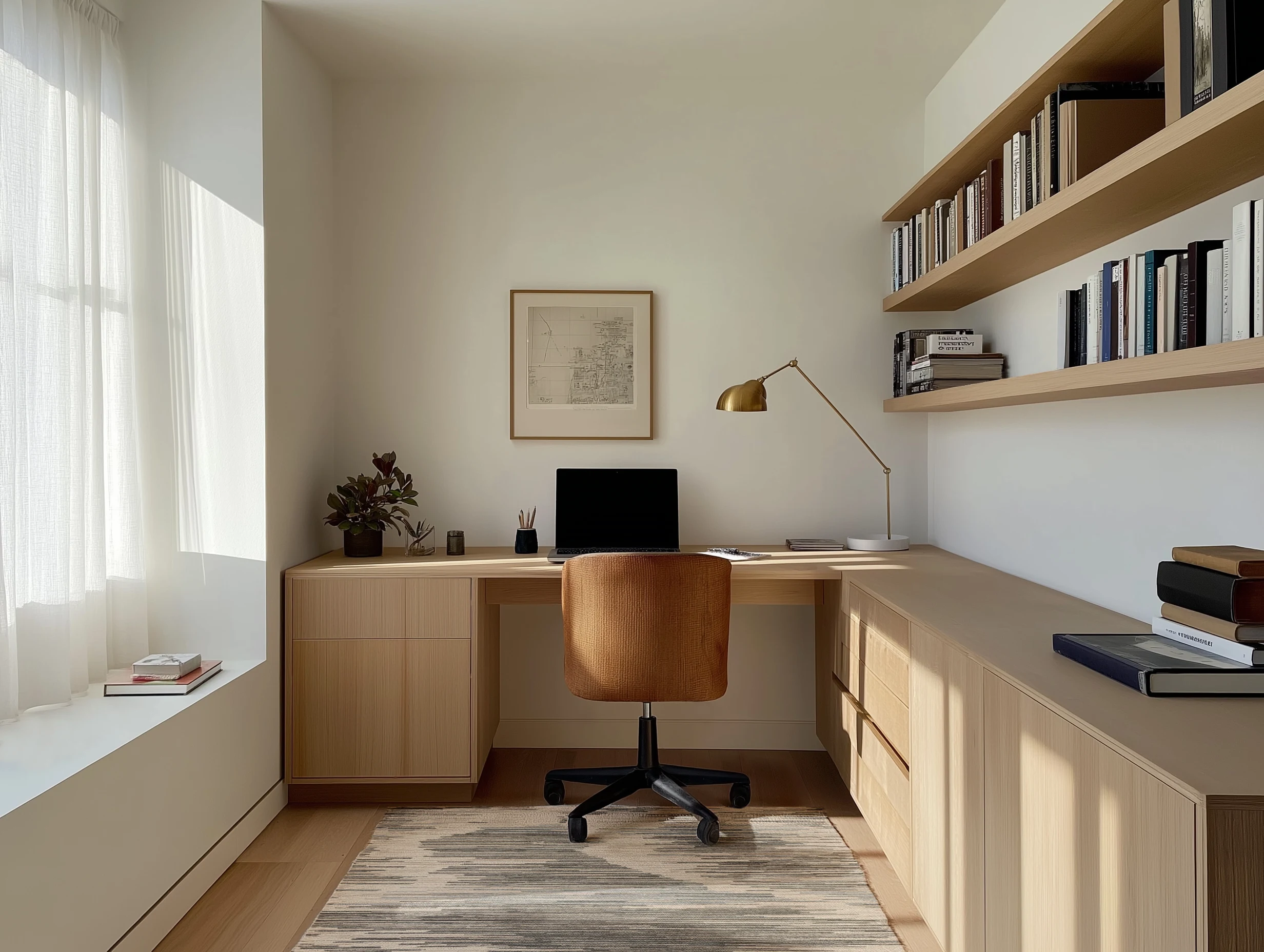 Transform your home office into a minimalist space with wood finishes, creamy white wall paint and neutral tones. Sheer curtains and a neutral rug enhance the natural vibe. Explore the design.