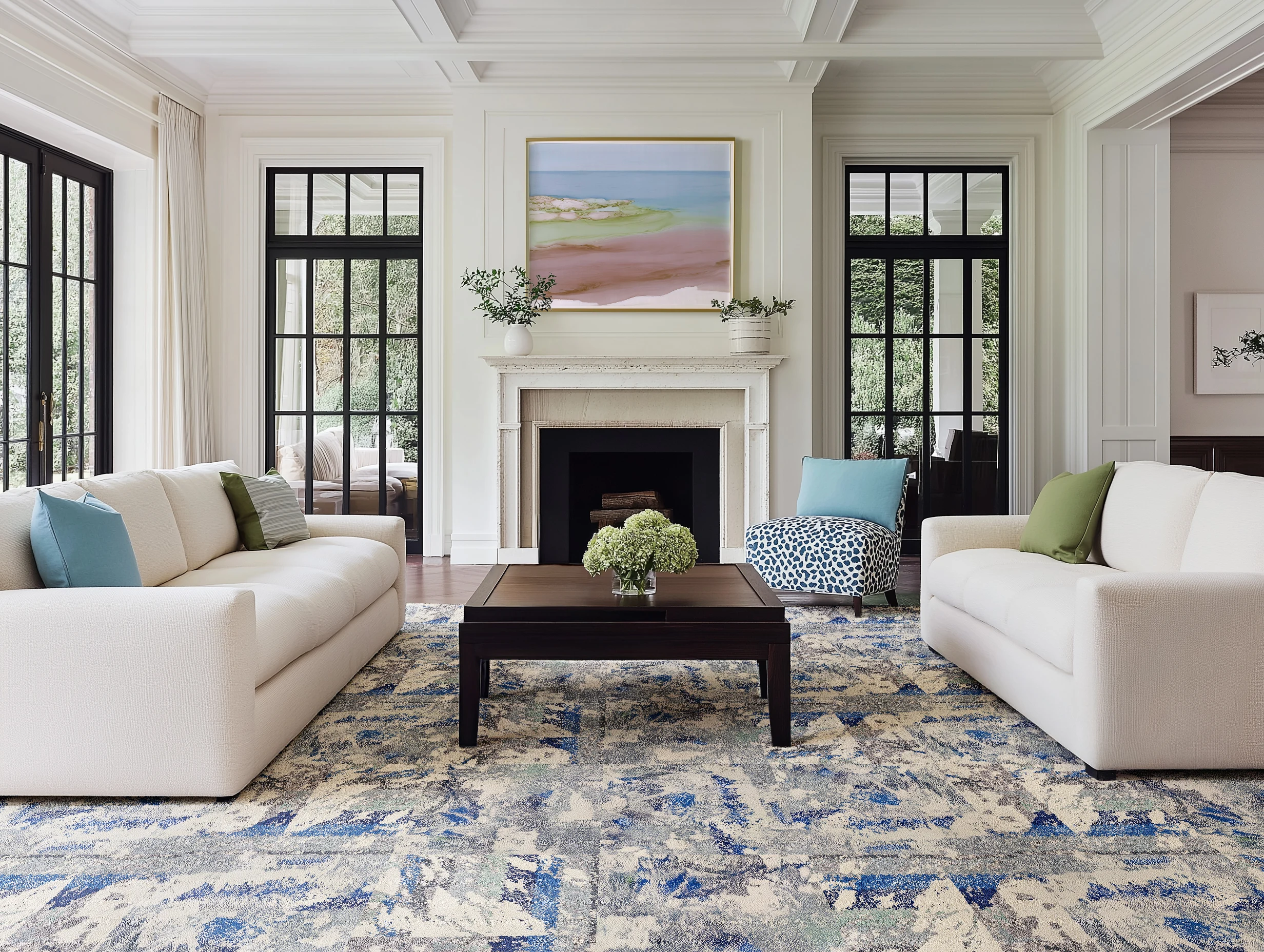 A painterly blue rug spans the room, paired with ivory upholstery and black-framed doors. Pleated drapery and tailored trim add structure.