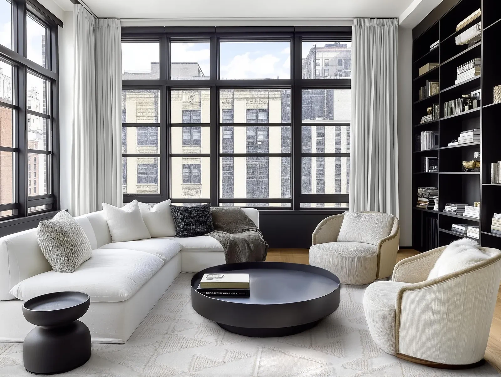 Crisp white upholstery paired with a monochrome rug enhances the spaciousness, while sleek window treatments allow light to flow. Discover these materials to create a refined, minimalist living space.