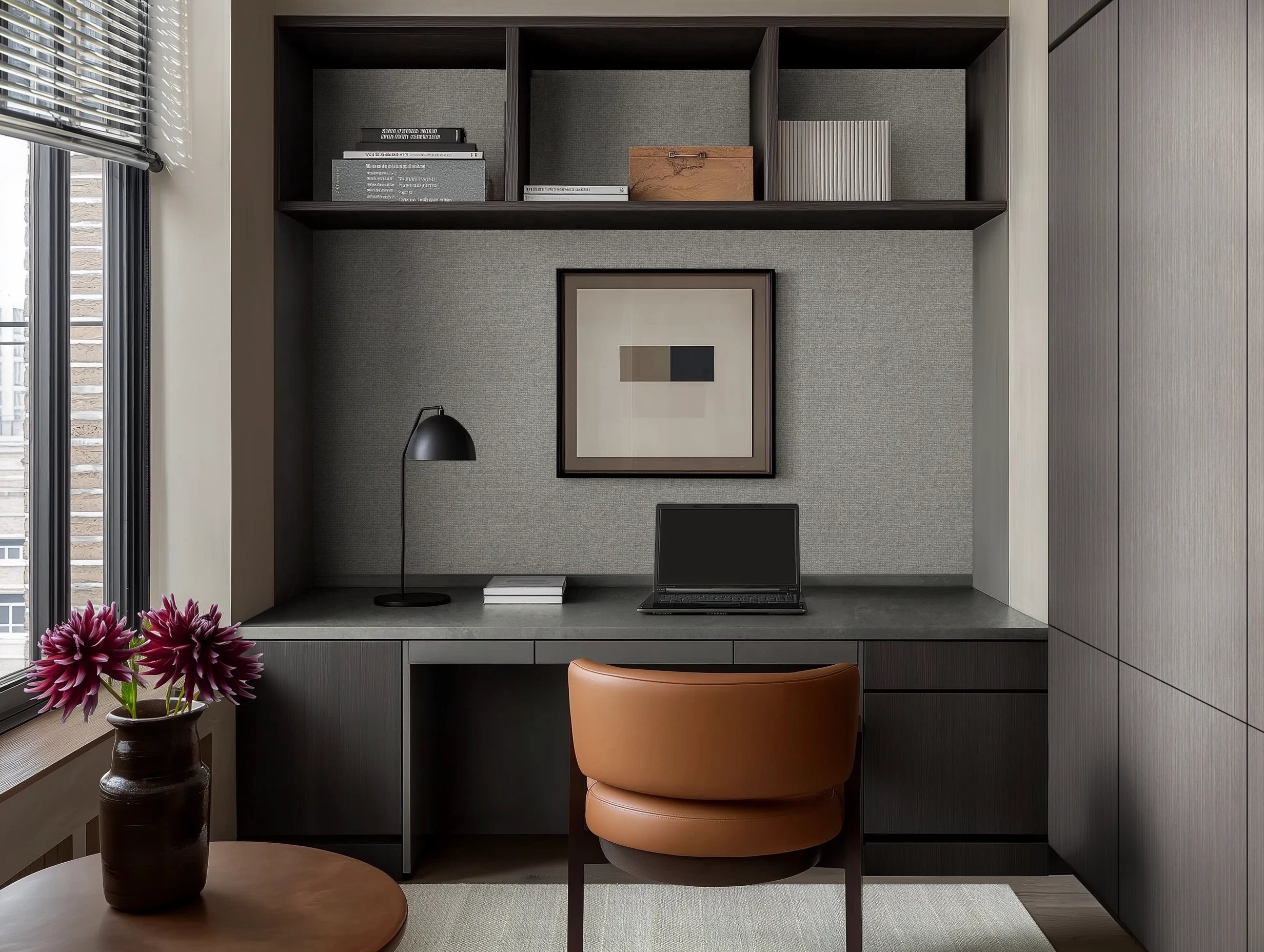 A grey desk pairs with wood laminate cabinetry, while a caramel leather chair provides a soft contrast. Neutral paint tones and a subtle rug create a cohesive look. Refine your office style.