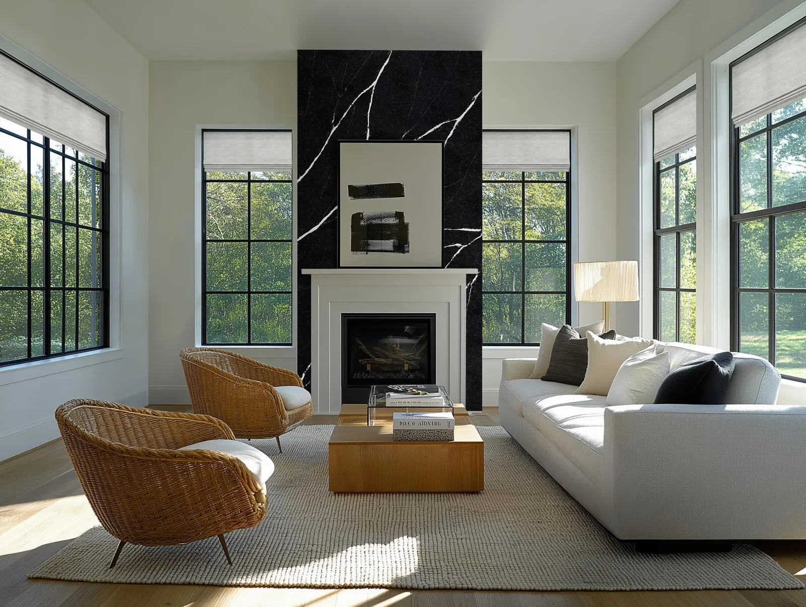 Soft white paint and warm wood flooring pair with wicker and linen upholstery for a natural touch. Roman shades allow light to filter through. Explore these materials to create a cozy, modern living room.