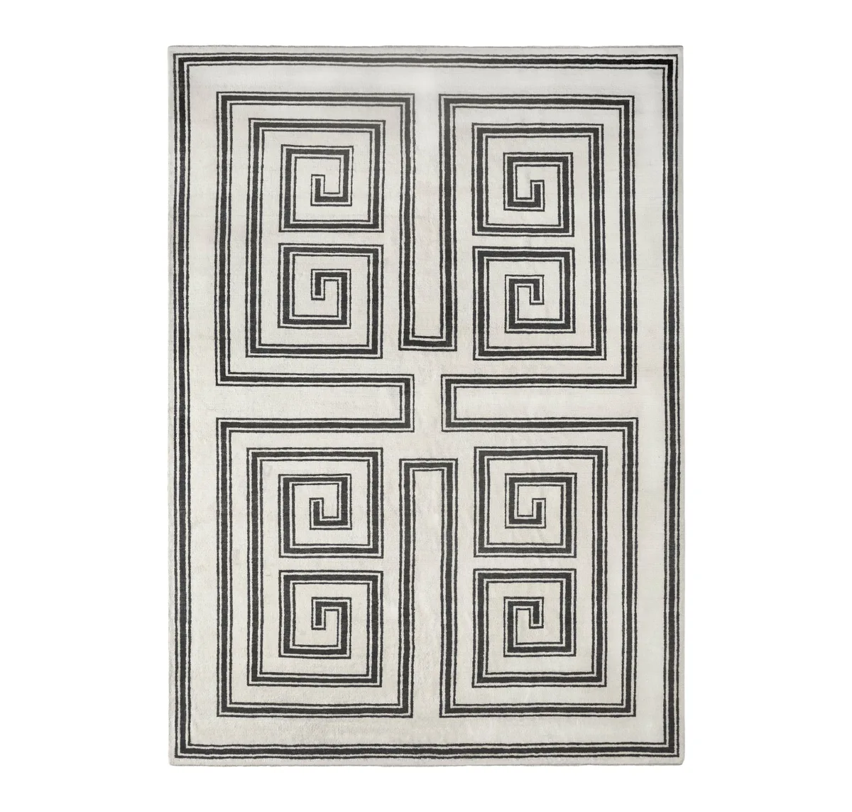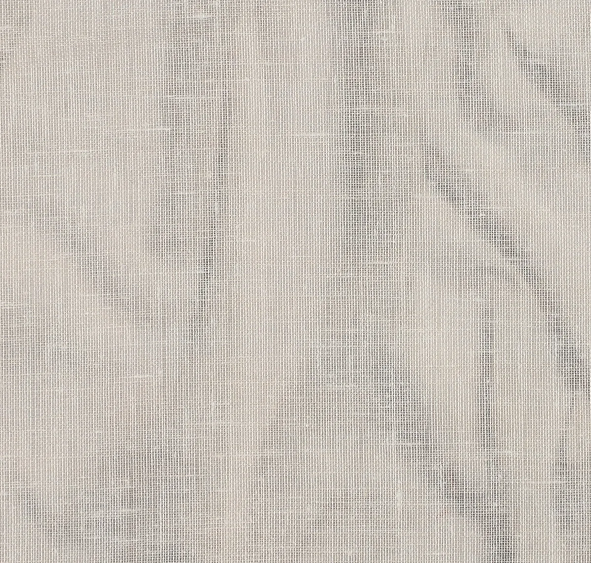 Layered drapery, a rust-toned chaise, and textured pillows sit over a wool area rug. Pale green walls and warm wood add grounding contrast.
