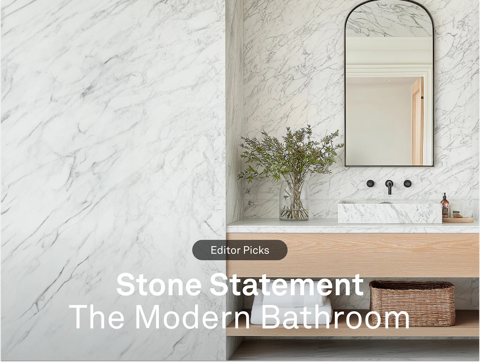 Softly veined marble brings timeless elegance to this minimalist bath. From the sculptural sink to the matte black fixtures, every detail invites serenity through texture, contrast, and organic simplicity.