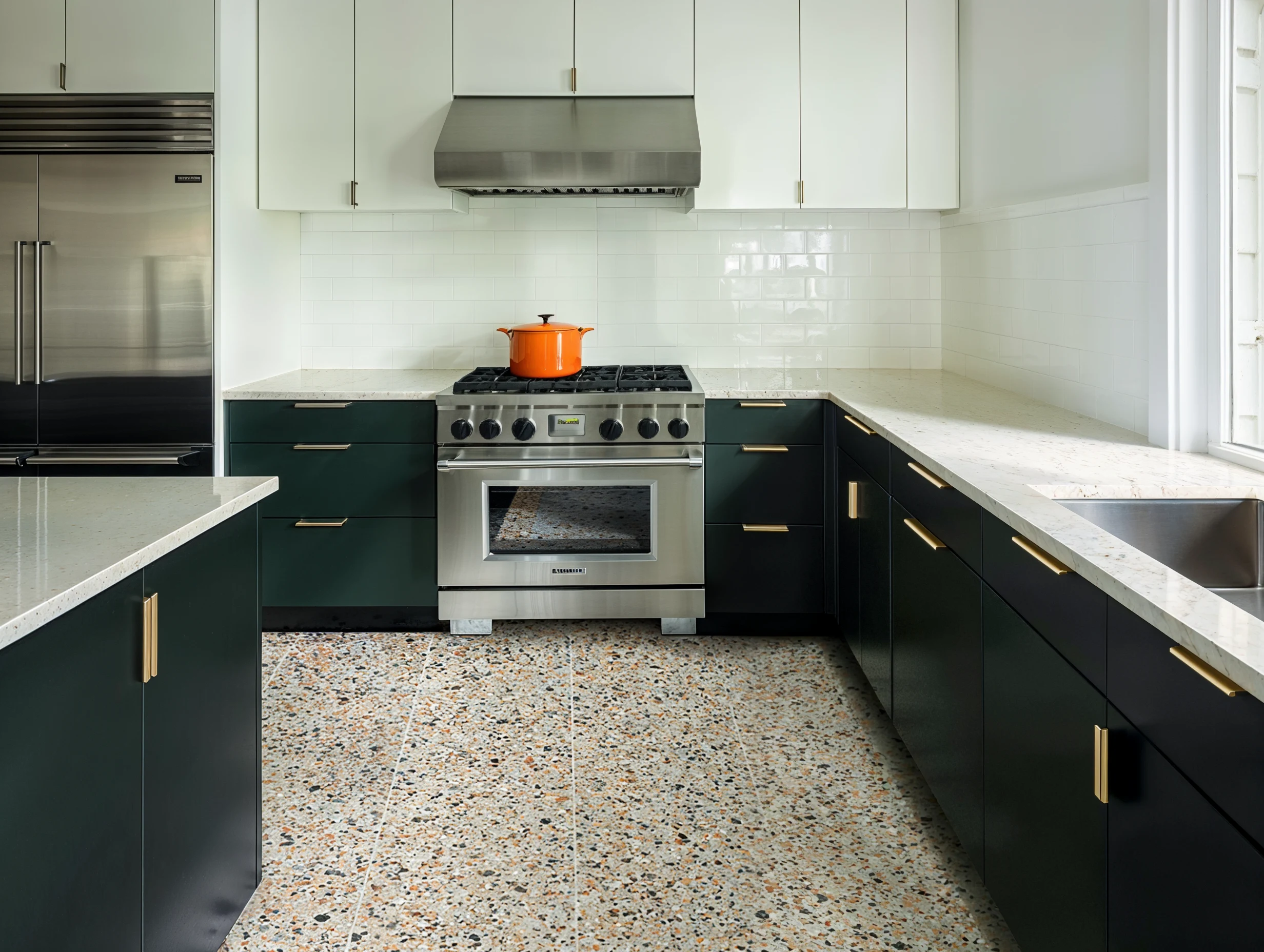 Sleek cabinetry and white countertops complement the terrazzo flooring, bringing modern elegance with a playful twist. Sample these materials to transform your kitchen today.
