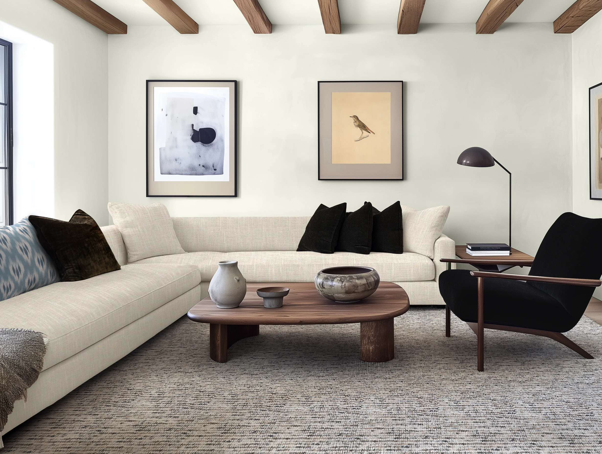 Slate and oatmeal hues combine with exposed oak beams in a minimalist living room design.