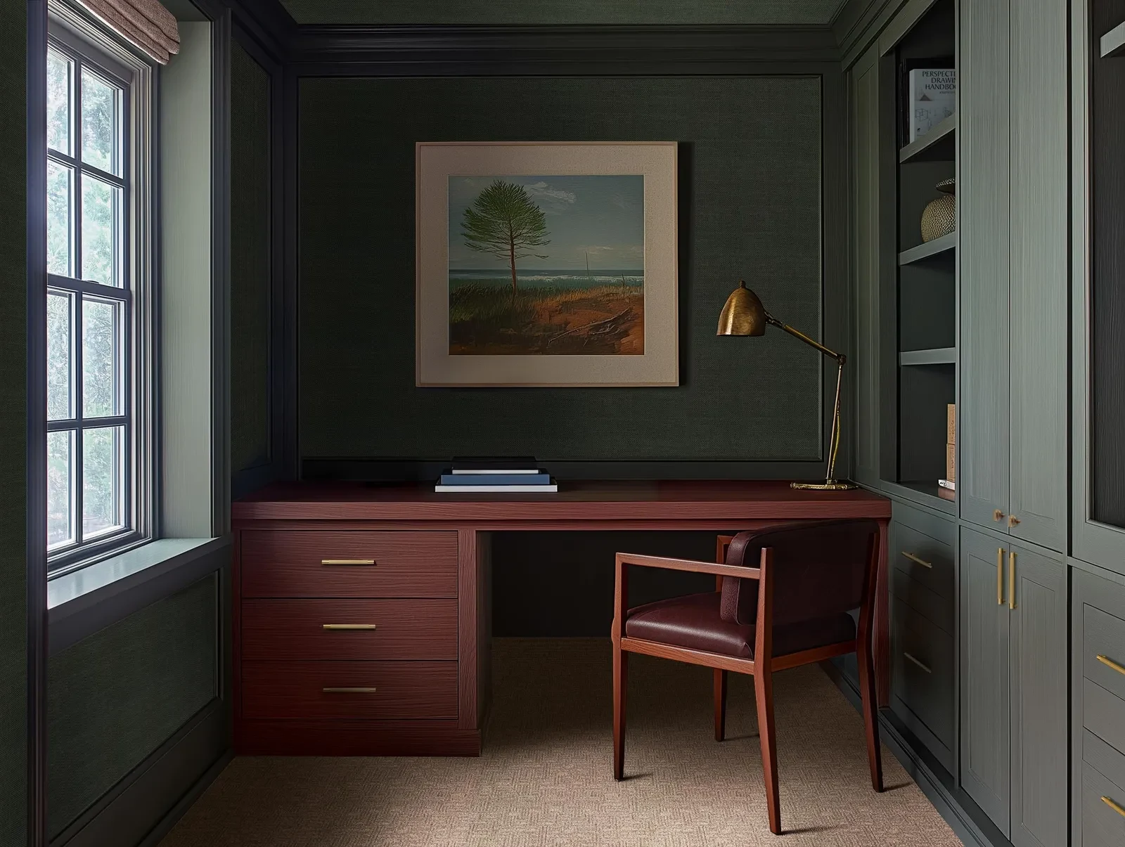 Deep green grasscloth walls and custom cabinetry with brass accents define this sophisticated office space. Explore the warmth of rich wood tones and tactile texture