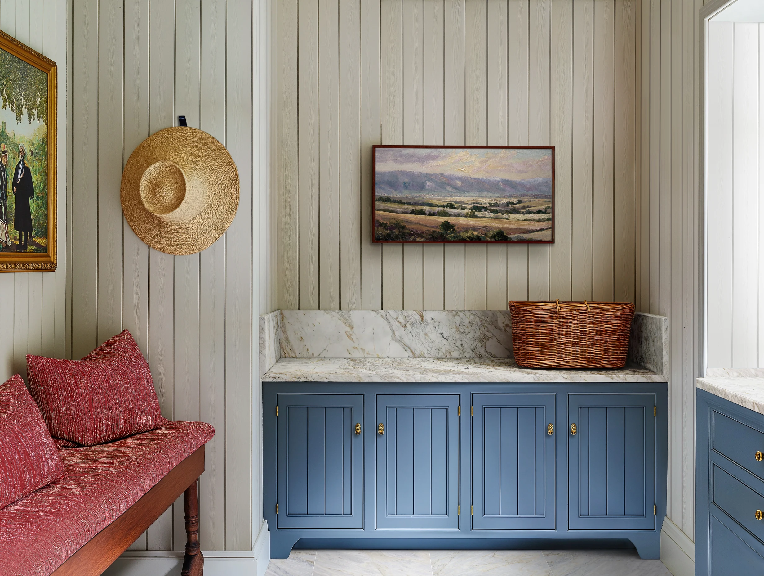 Blue-painted cabinetry pairs with wood paneled walls, a marble countertop and stone floors in this mudroom. Sample these materials to get a stylish multipurpose nook.