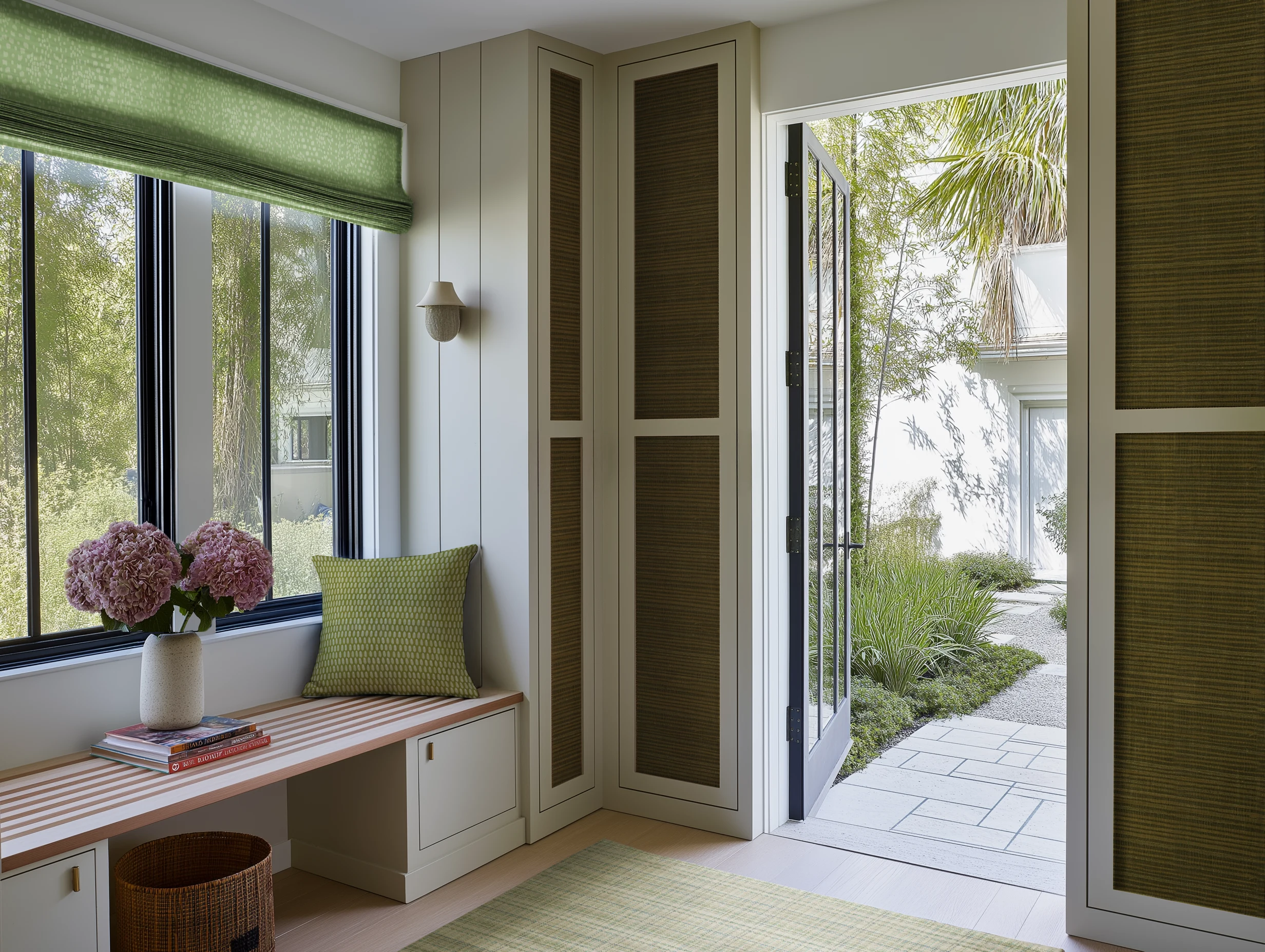 Grasscloth paneling, soft white walls, and pale oak flooring set a warm tone in this modern mudroom. Green accents and woven texture bring a natural, coastal vibe.
