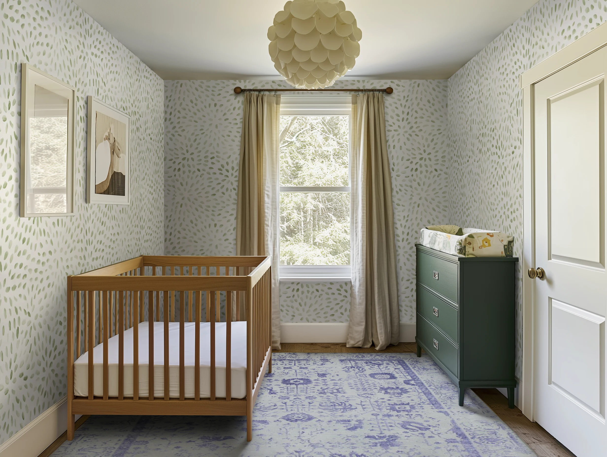 This serene nursery features calming green wallpaper, neutral drapery, and a soft area rug. The green painted dresser complete the natural look. Create this nursery by sampling these materials.