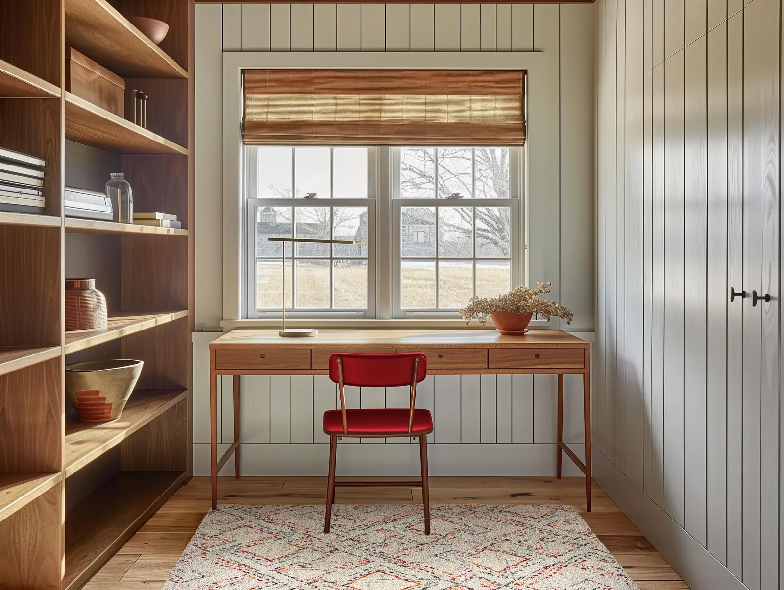 Discover the warmth of natural wood floors paired with sleek, neutral-toned walls. The woven window shades introduce a soft, earthy texture, enhancing the calming ambiance.