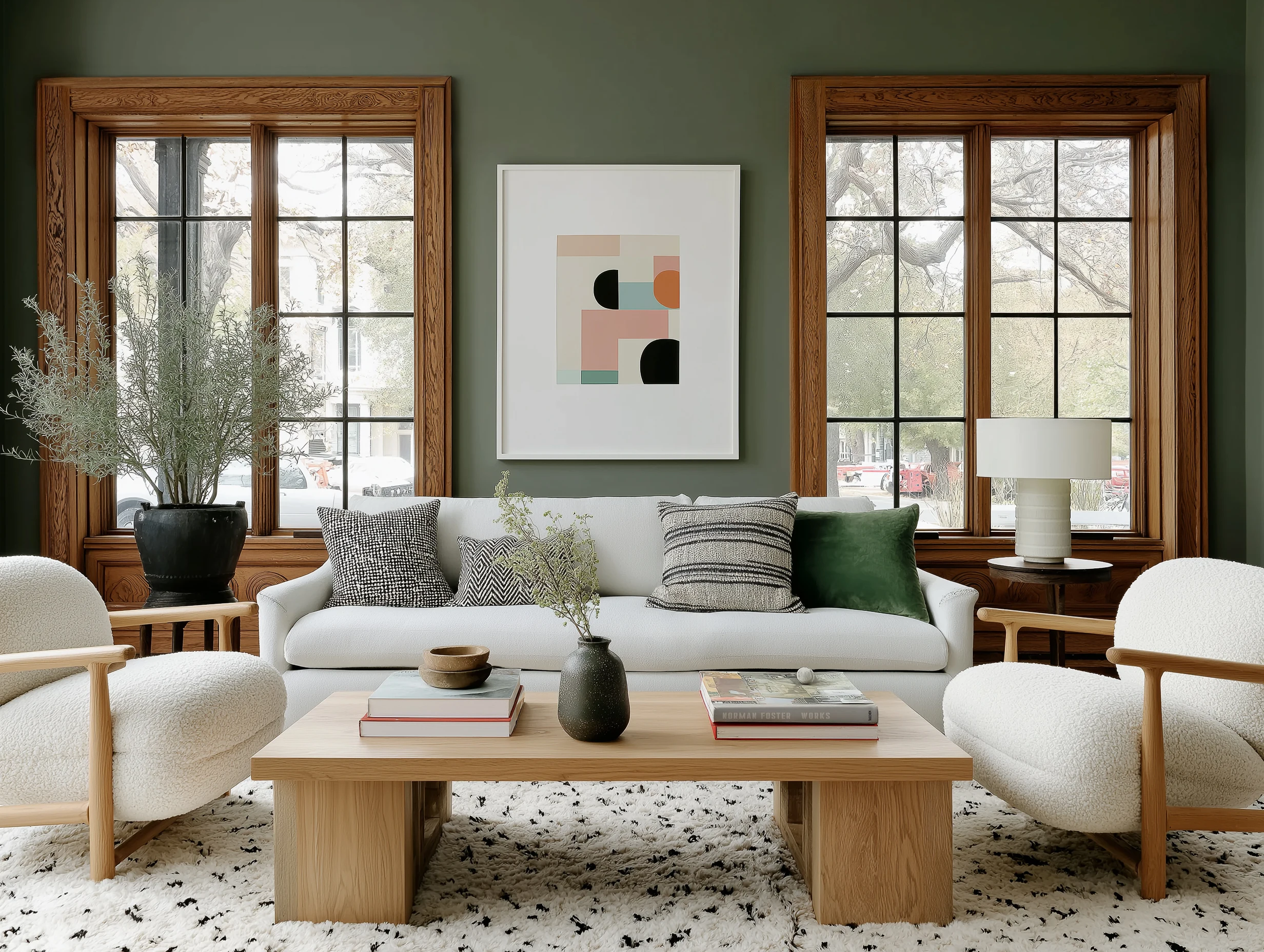 Sculptural chairs and white boucle play against dark-stained trim and matte green walls for a high-low balance of texture and tone.