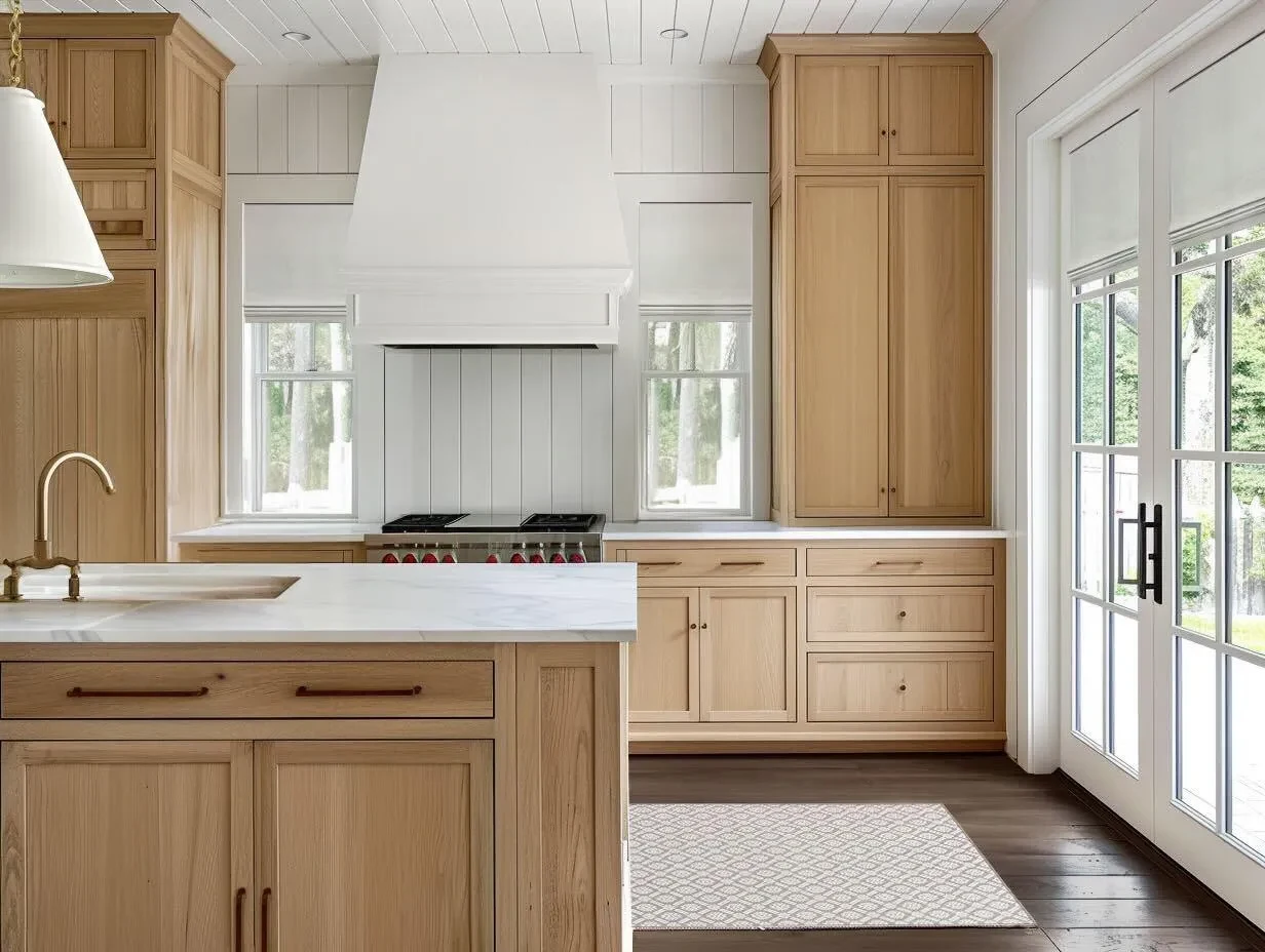 Embrace the warmth of this kitchen with wood cabinetry, white countertops, and elegant Roman shades. Dark wood floors add contrast, while the rug introduces a touch of texture. Sample to recreate the look.