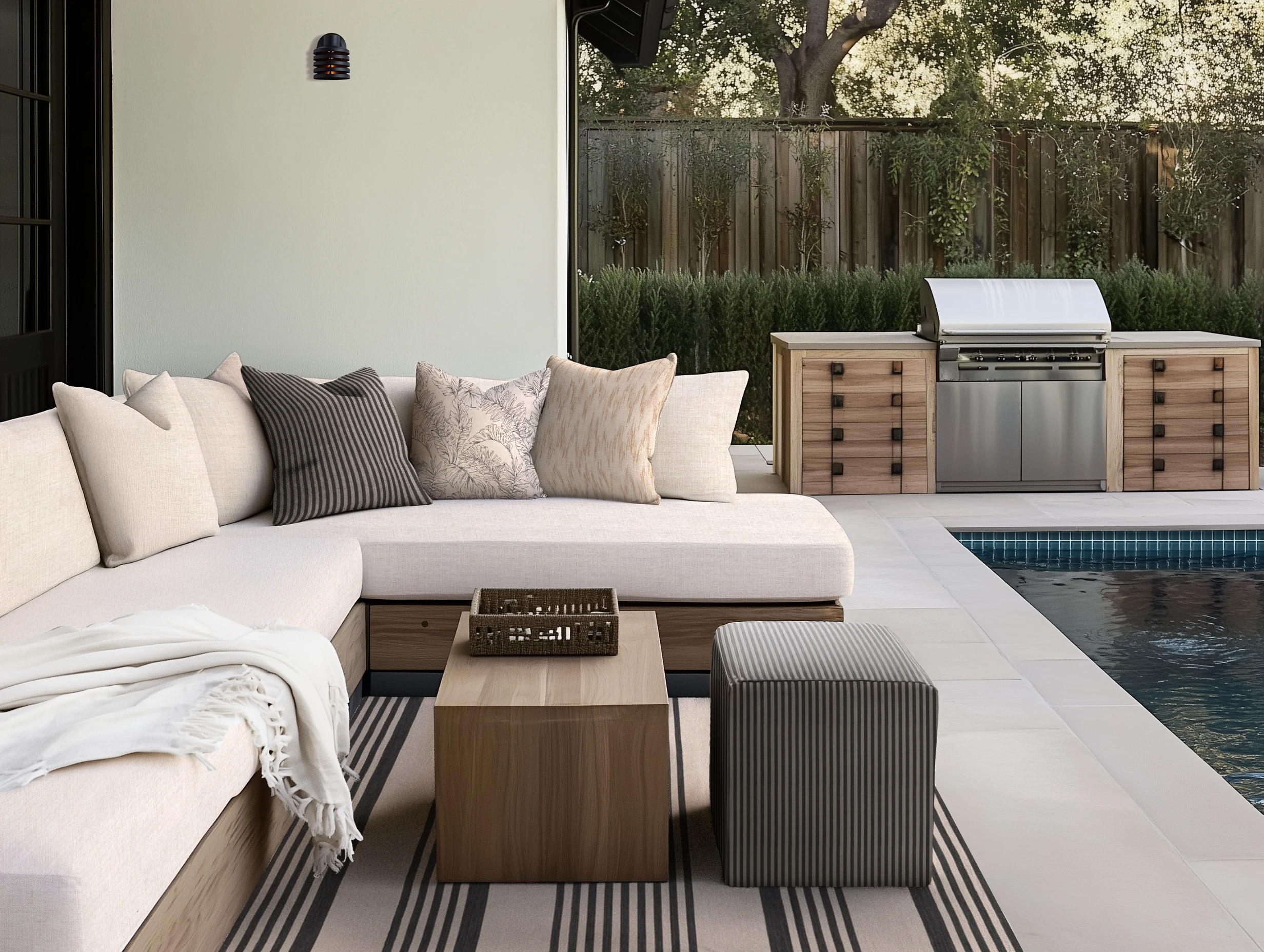 Neutral tones and soft textiles blend to create a restful poolside lounge, ideal for sunny relaxation and leisure.