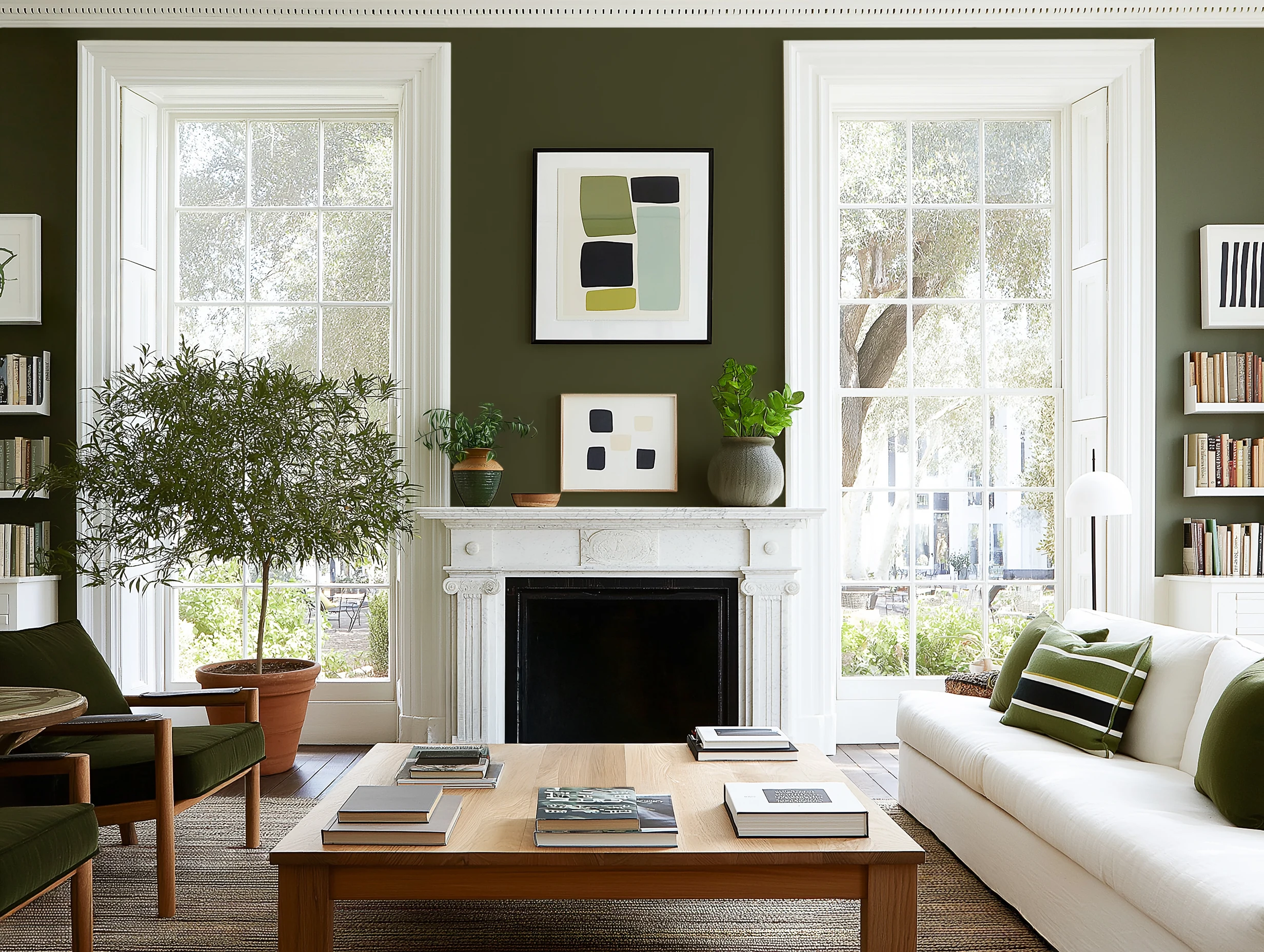 Deep olive paint and crisp white trim dial up the contrast while a marble mantel adds polish underfoot.