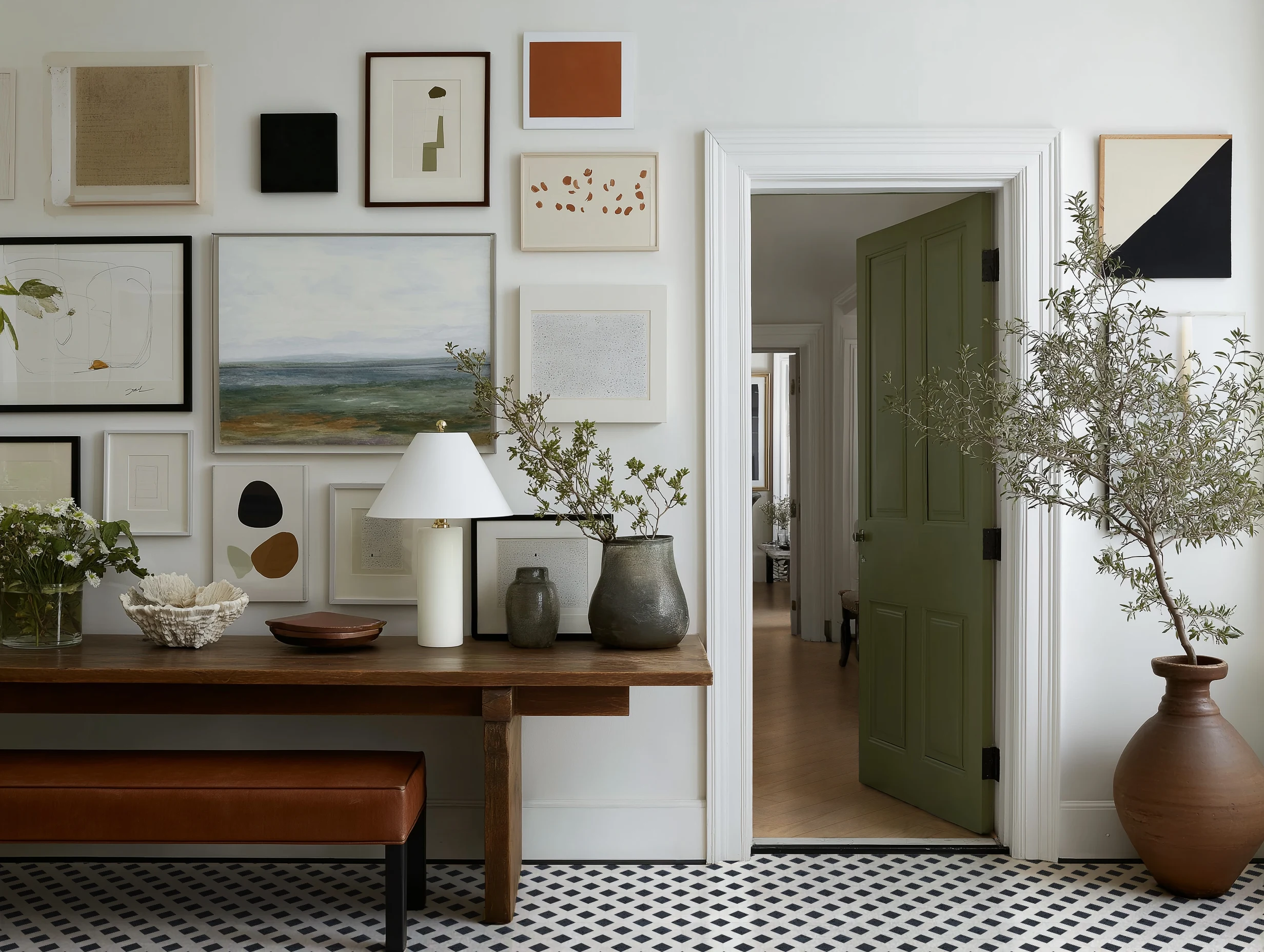 A painted olive door and graphic tile floors bring punch to a neutral hallway layered with a gallery wall and warm wood furniture.