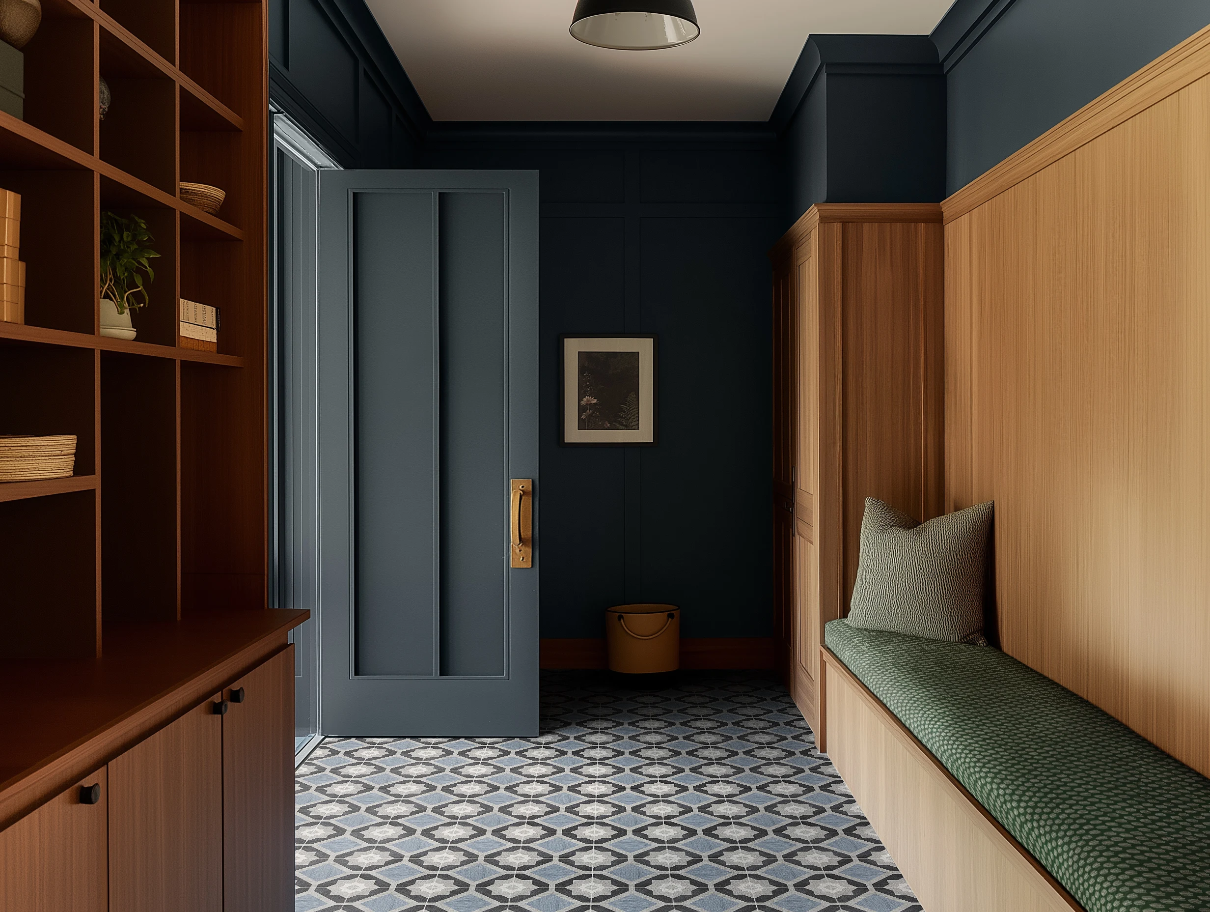 Deep blue walls contrast with natural wood storage and built-ins. Geometric tile flooring anchors the space, while a cushioned bench and matte hardware complete the design.