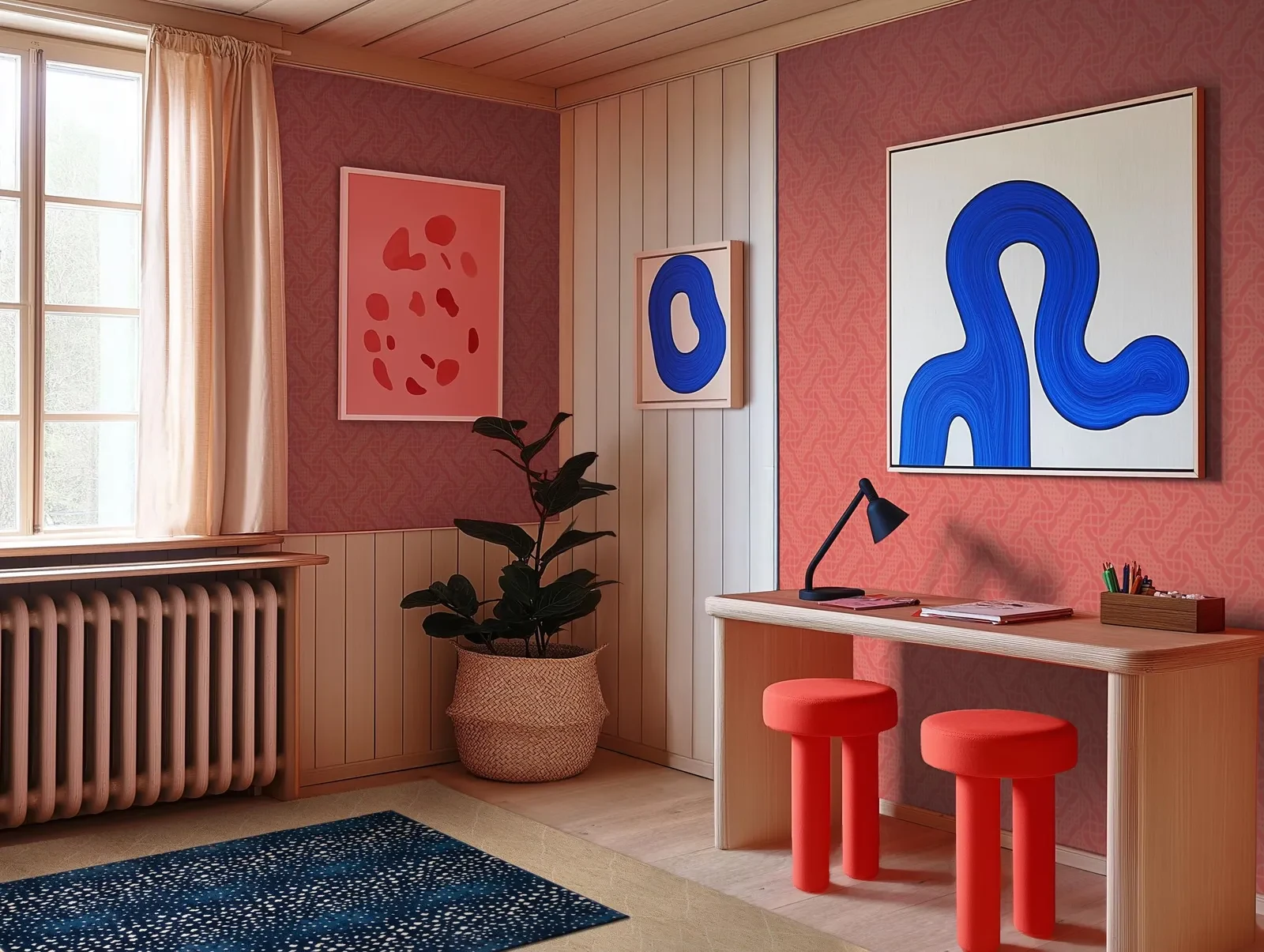 Energize your workspace with vivid hues and cozy textures, creating a vibrant, inspiring corner for creativity. Explore the materials to start your renovation.