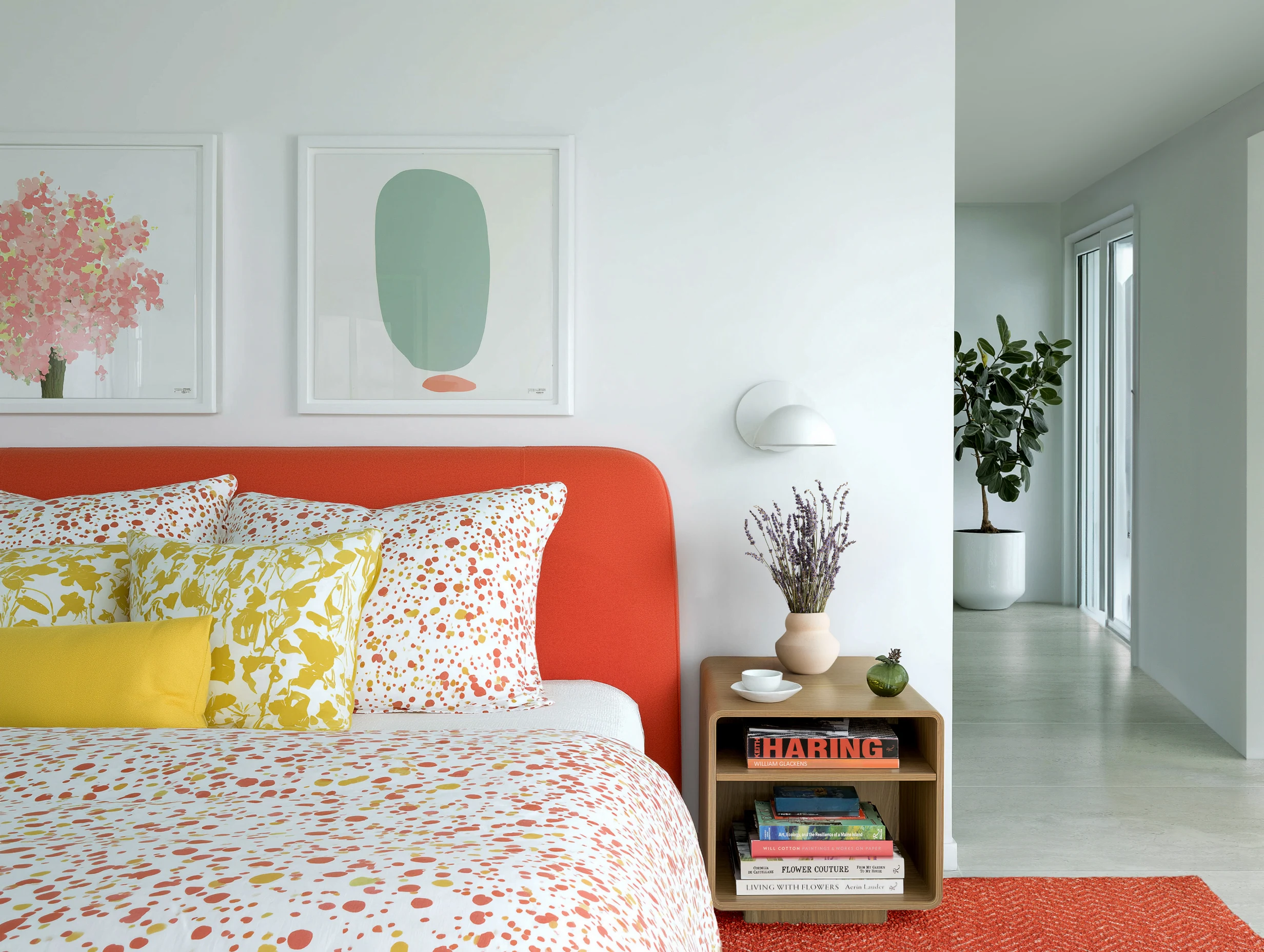 Yellow and red patterns mix across pillows and bedding, framed by pale concrete-look floors and simple white walls.