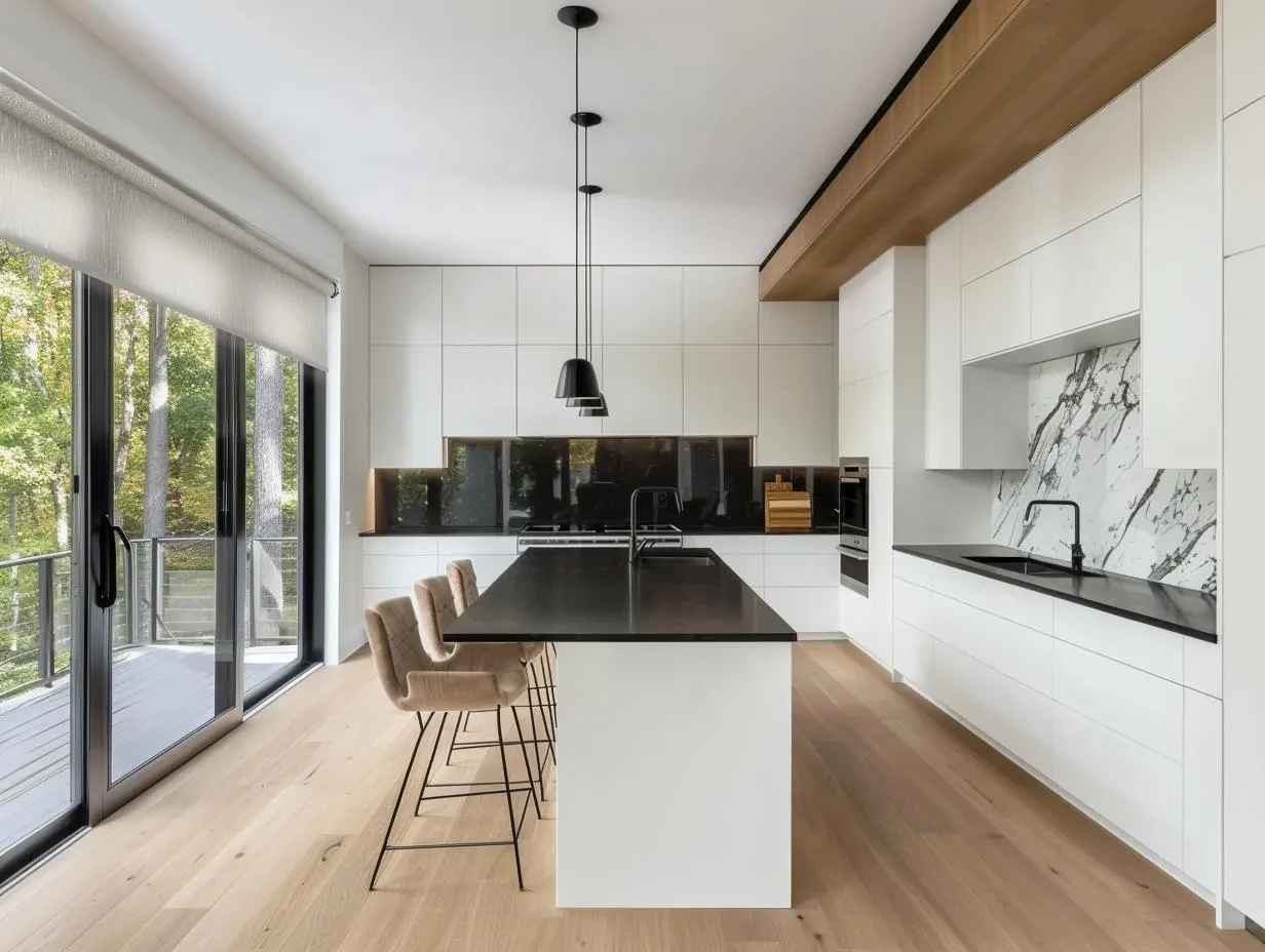 Sleek black countertops contrast beautifully with white cabinetry and light oak flooring in this contemporary kitchen.