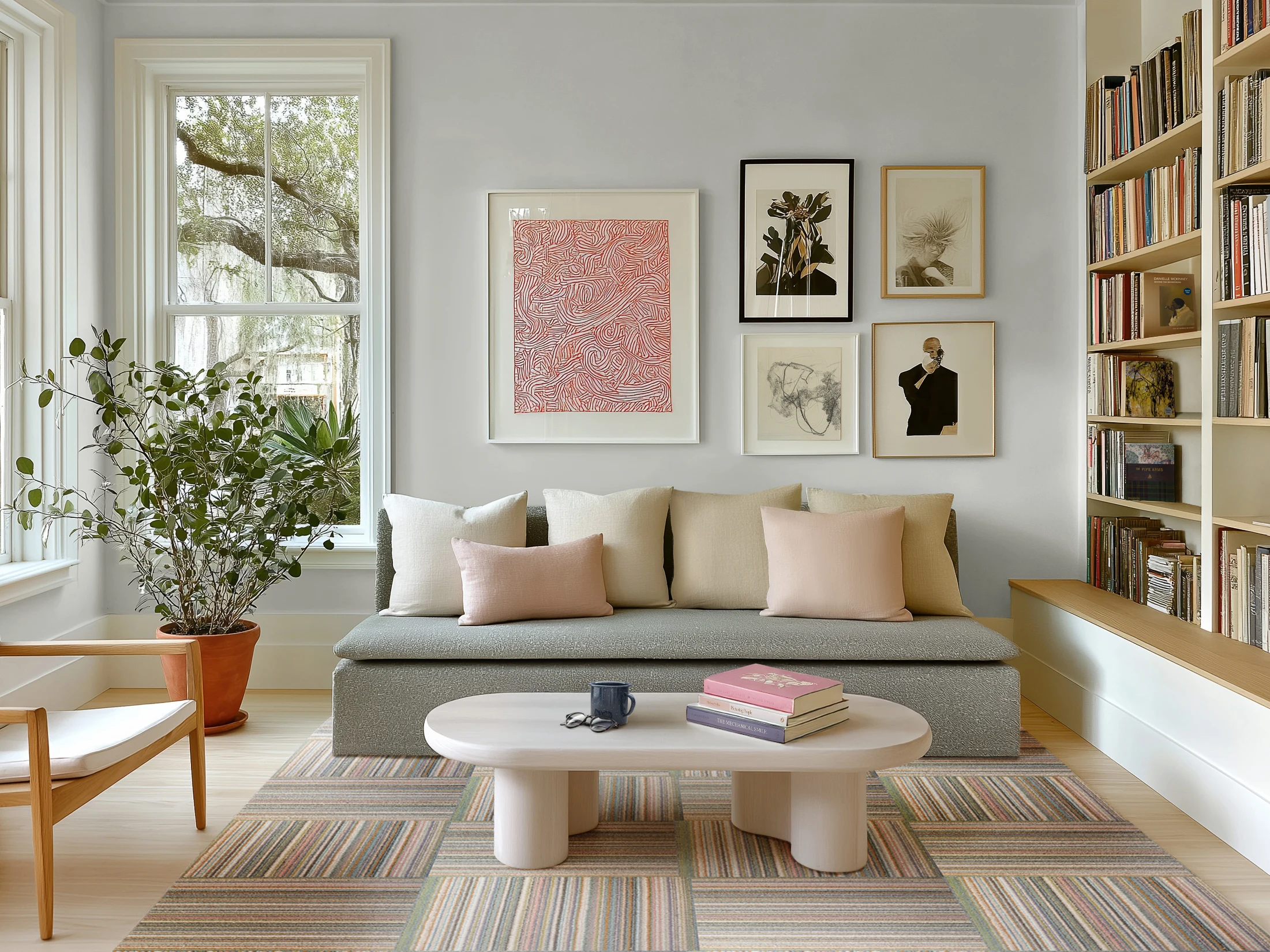 Soft grays, blush pink and a striped rug define a space that’s ideal for settling in with a book.
