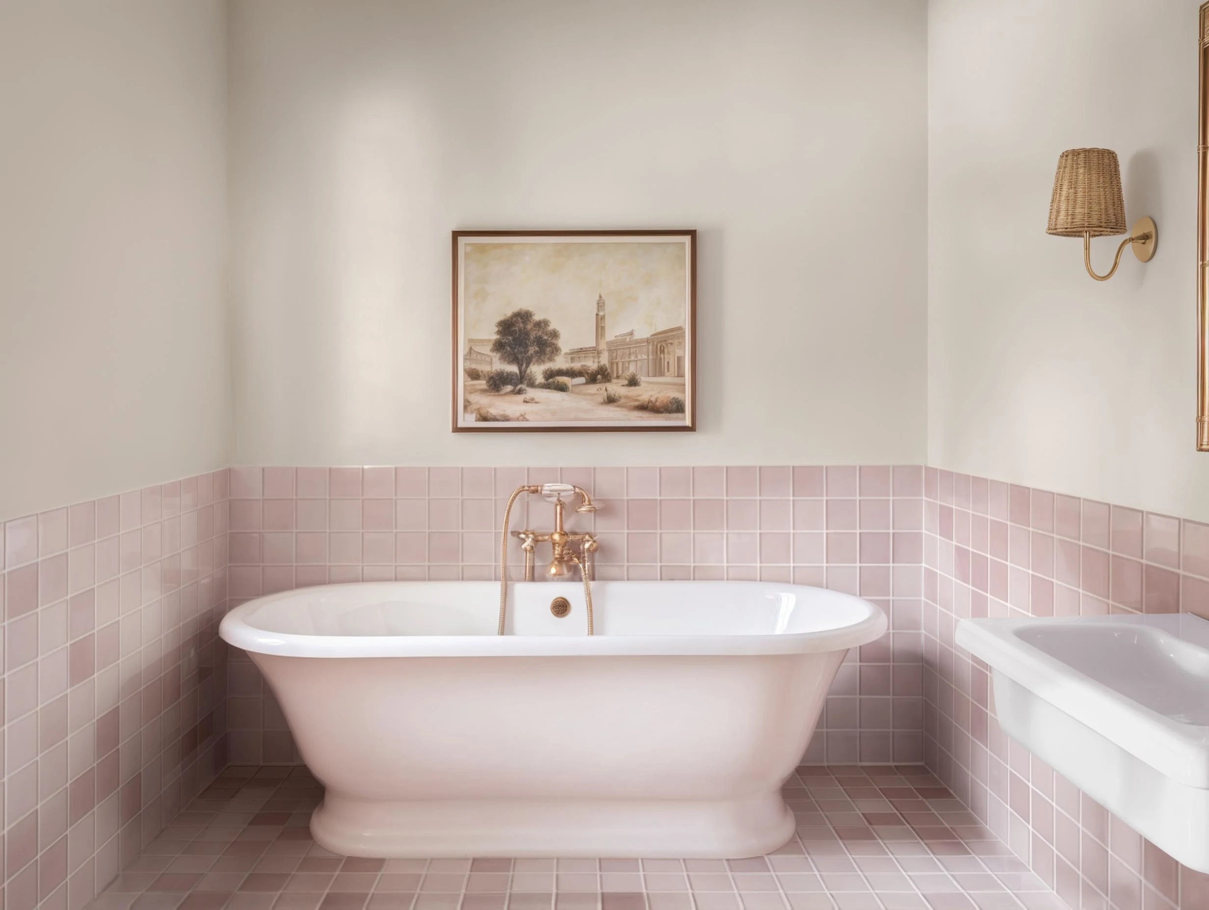 Charming pink tiles evoke a retro-modern aesthetic in this bathroom accented with elegant brass hardware. The light hardwood floor adds a touch of natural warmth. Sample the design to elevate your space.