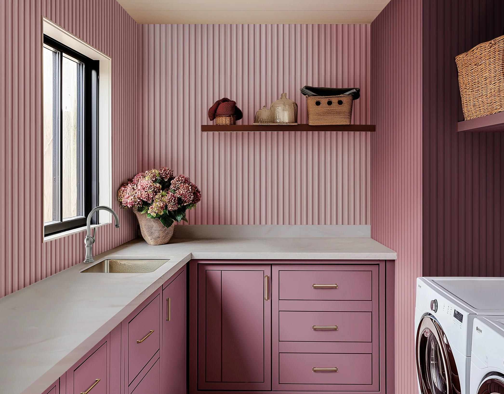 Muted rose cabinetry, floral floor tiles and mixed metals bring a warm glow to this utility space. Cream countertops complete the look. Opt for these designer details for your laundry room makeover.
