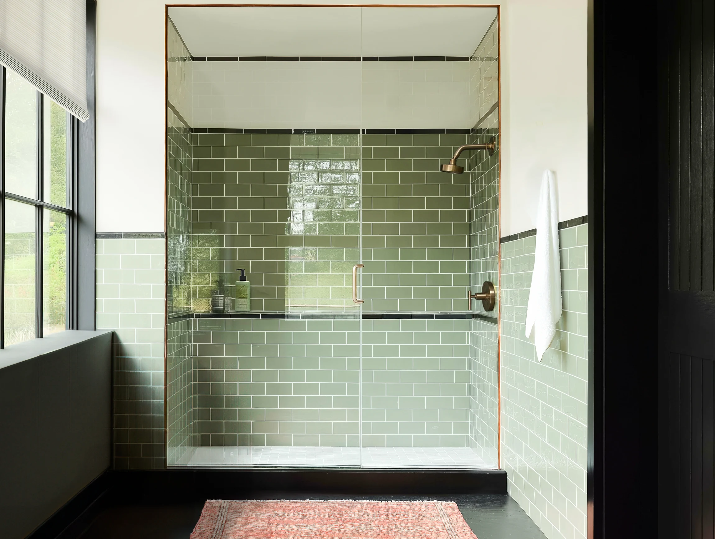 Black trim tile adds sharp definition against green subway tile walls, proving how a simple color break can elevate a bathroom design with a clean, modern edge