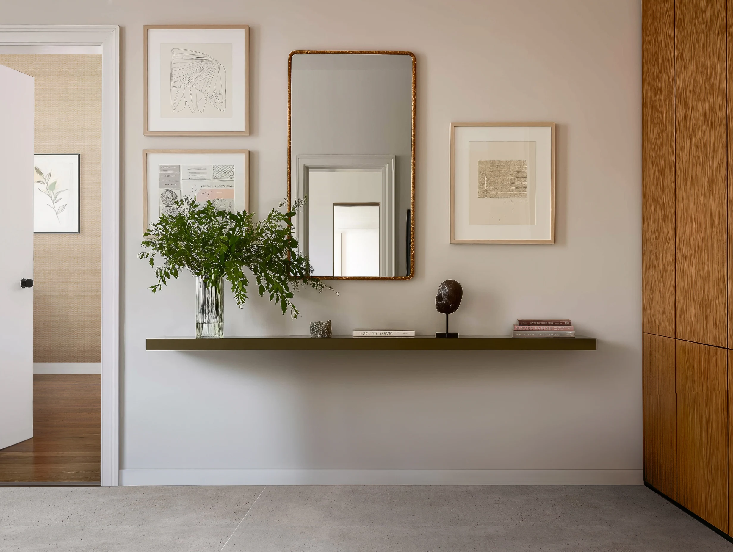 Neutral tones and rich textures shine in this hallway that doubles as a front entry space.