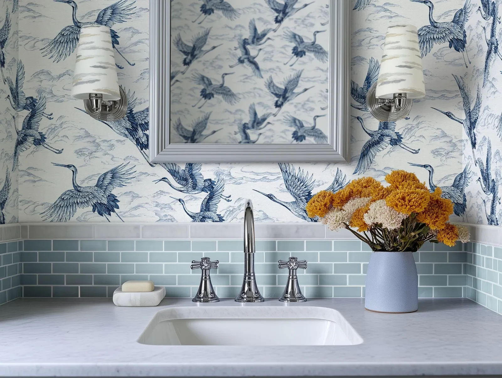 Graceful crane-patterned wallpaper pairs with soft aqua subway tiles and a marble countertop for a fresh, uplifting bathroom design. Explore this lively aesthetic today.