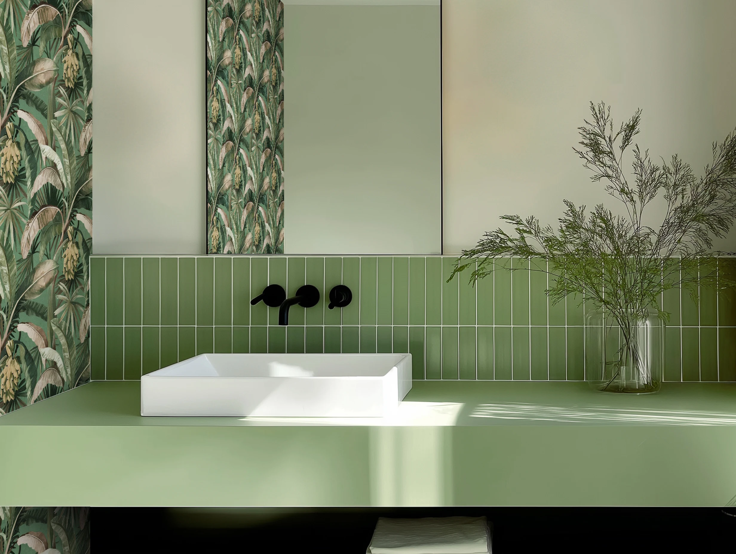 Vertical tile in a saturated olive hue pairs with jungle-print wallpaper and a squared-off vessel sink for a striking, material-driven composition.