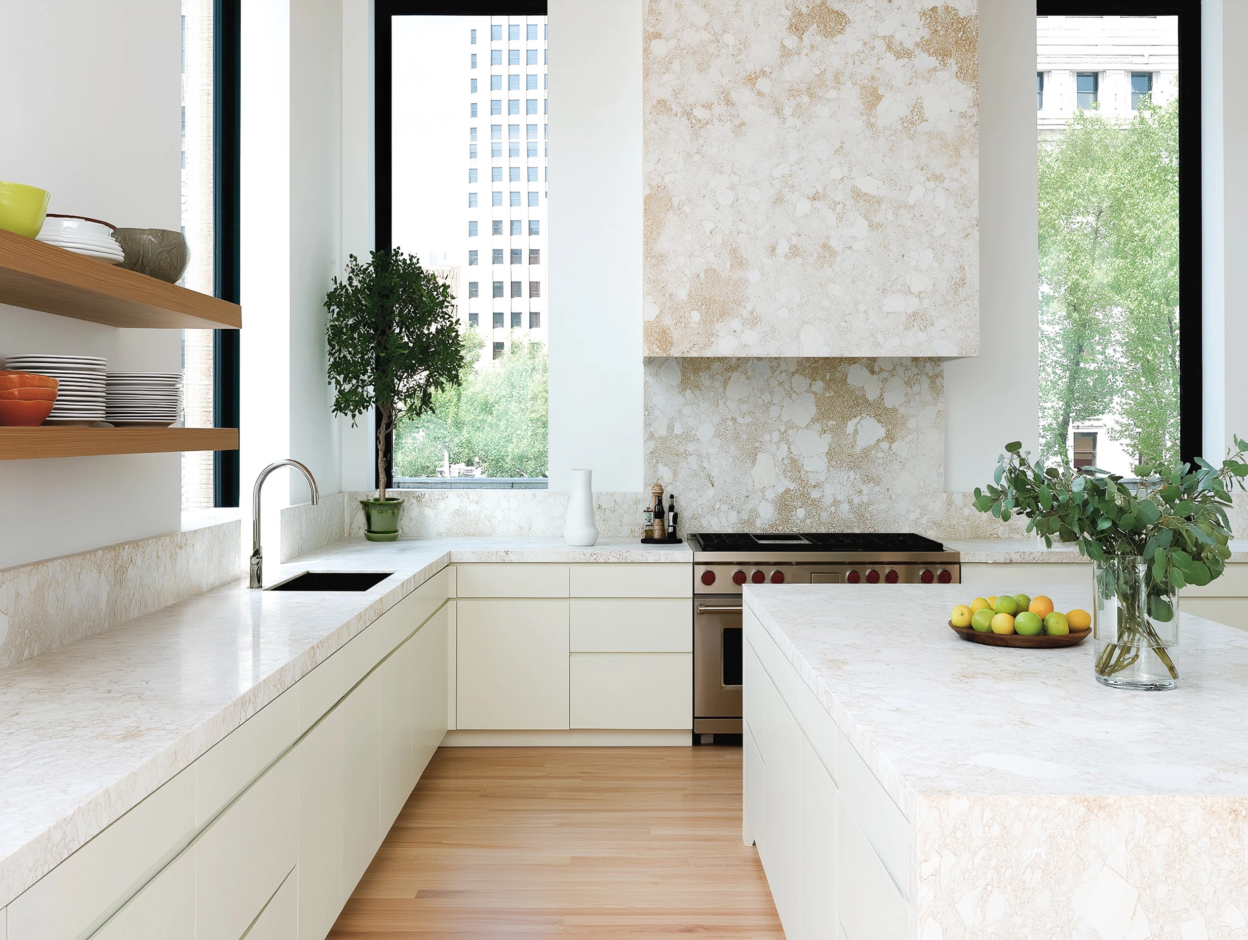 Stone surfaces stretch across the counters, backsplash, and hood. Pale cabinetry and warm floors keep the space light without going sterile.