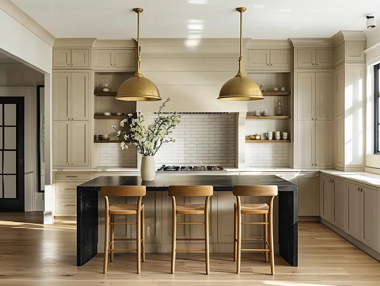 Recreate the look of this contemporary kitchen with beige cabinetry, black marble island, and light wood flooring.