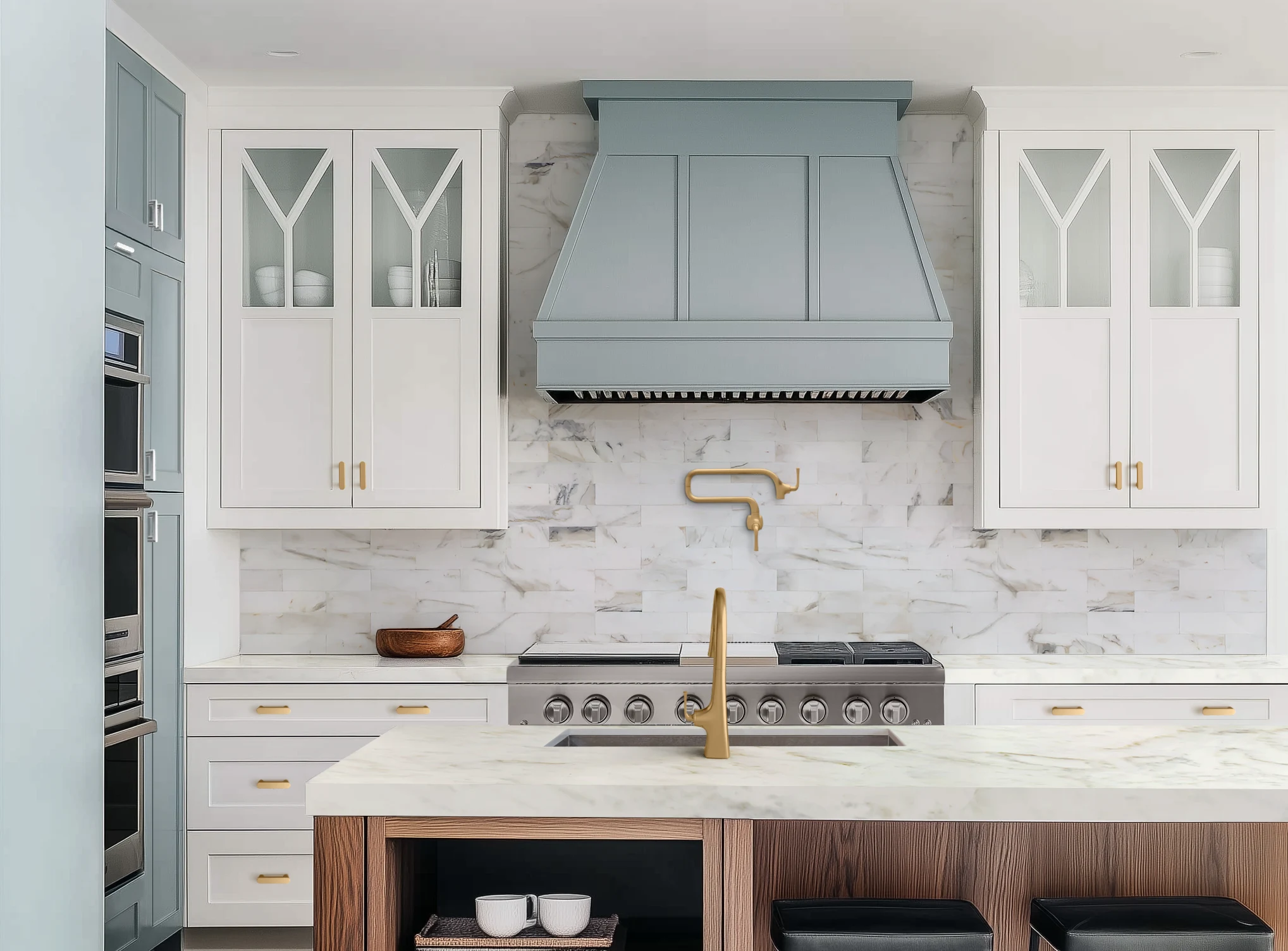 This kitchen features serene blue cabinetry highlighted by a mix of gold and chrome fixtures, presenting a stylish blend of colors and material using marble countertops to enhance its refreshing, visually appealing aesthetic.