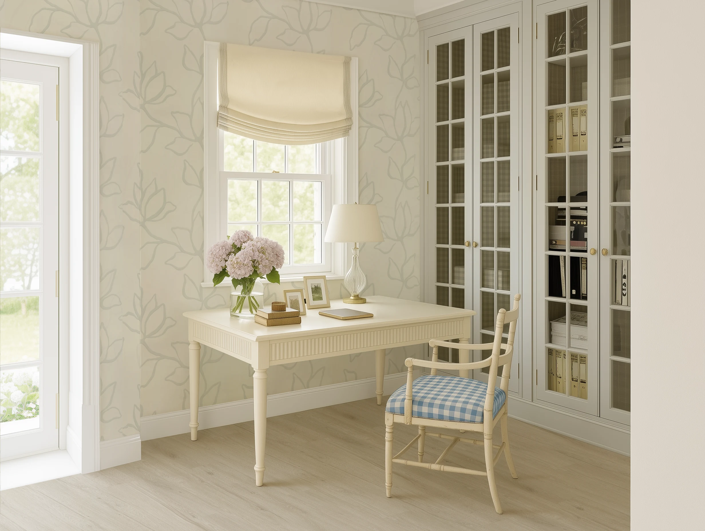 Pale floral wallpaper and sheer Roman shades soften the classic lines of the desk and gingham-upholstered chair in this traditional study.