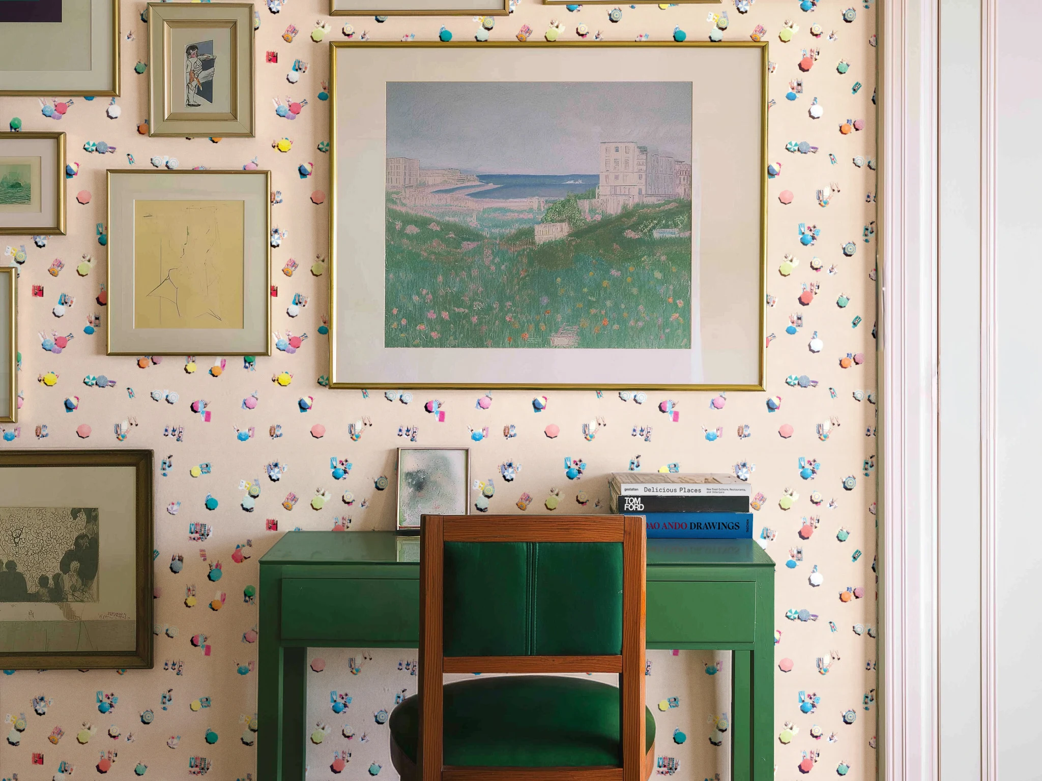 A green lacquer desk pops against a whimsical pink wallpaper dotted with candy-colored charm.