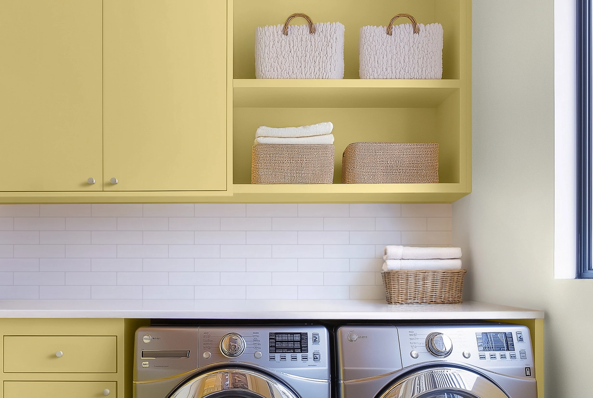 A backsplash of white subway tile meets fresh yellow cabinetry in this compact and efficient laundry room.