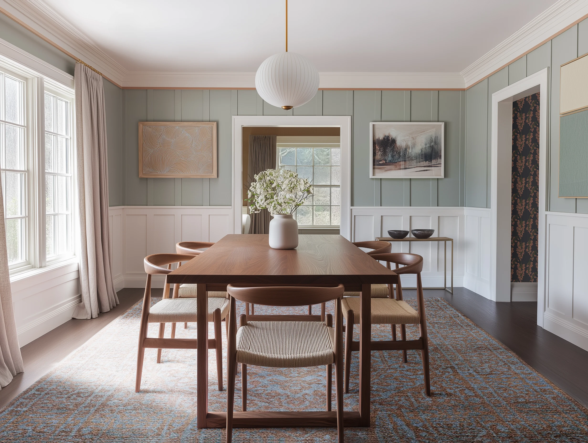 Soft blue-green paneling and crisp white wainscoting bring fresh contrast to this tailored dining room. Warm walnut wood tones and a dusty blue rug layer in timeless texture, blending traditional style with understated color.