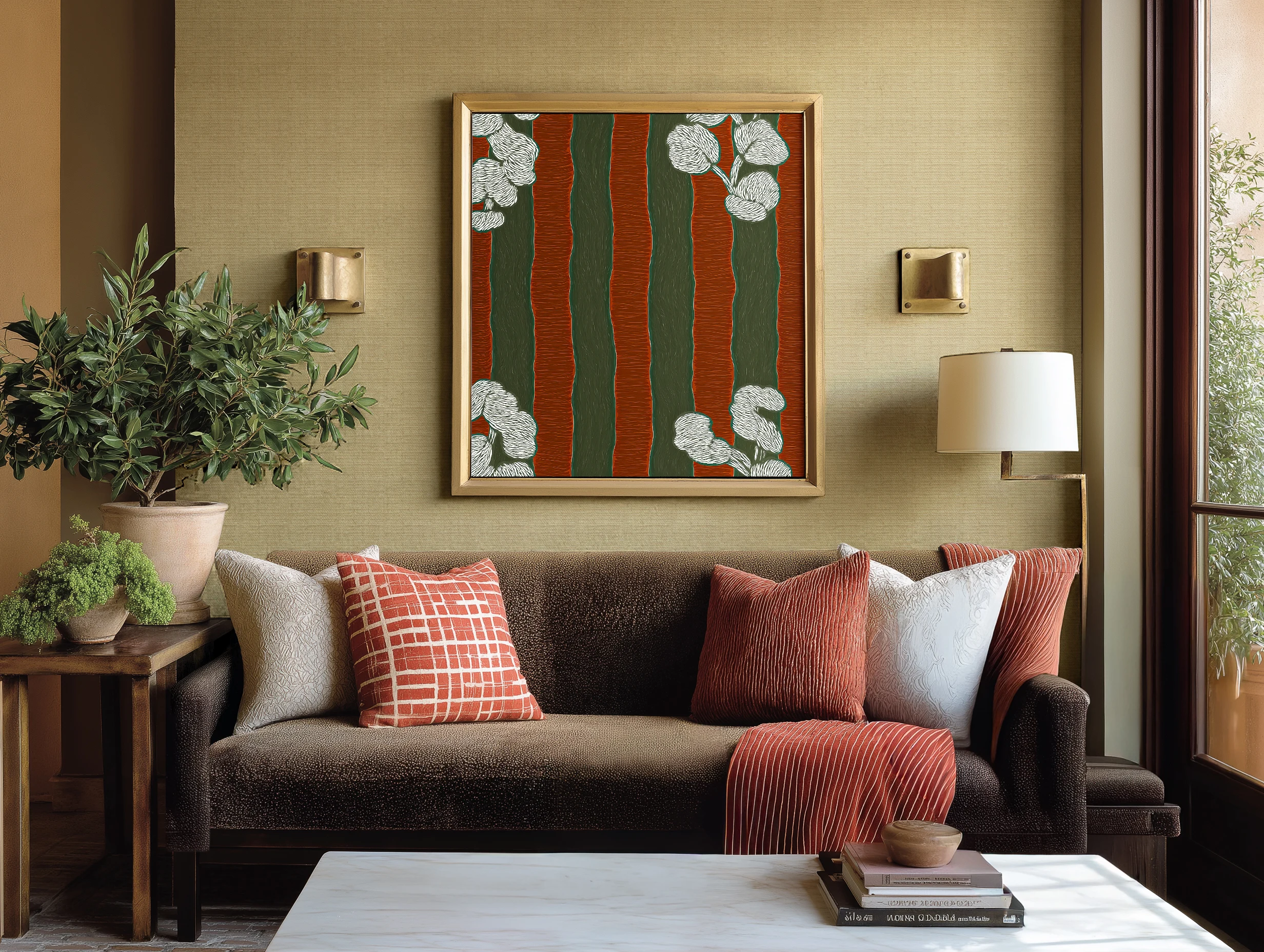 Grasscloth wallpaper sets a textured tone while a dark velvet sofa anchors the space in rich contrast against natural light and brick floors.