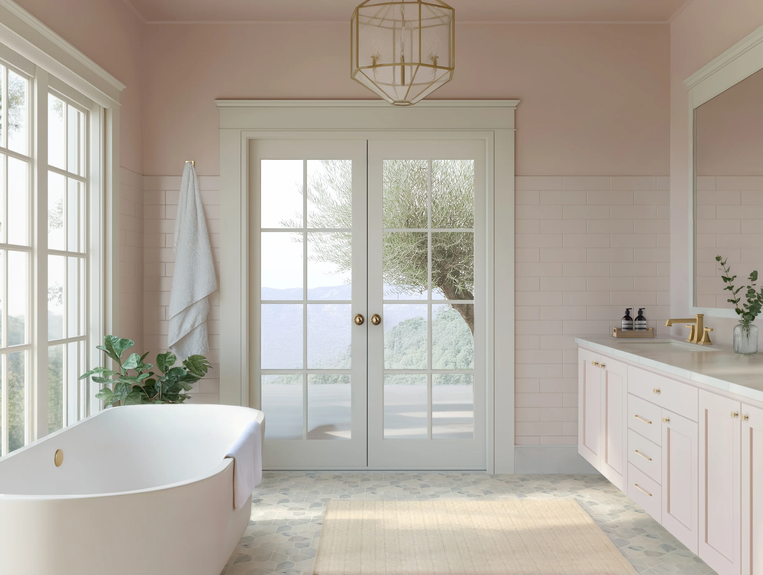 Tile used as wainscoting not only looks great, it’s practical in bathrooms. Here, it keeps the pink walls playful while adding durability where it’s needed most.