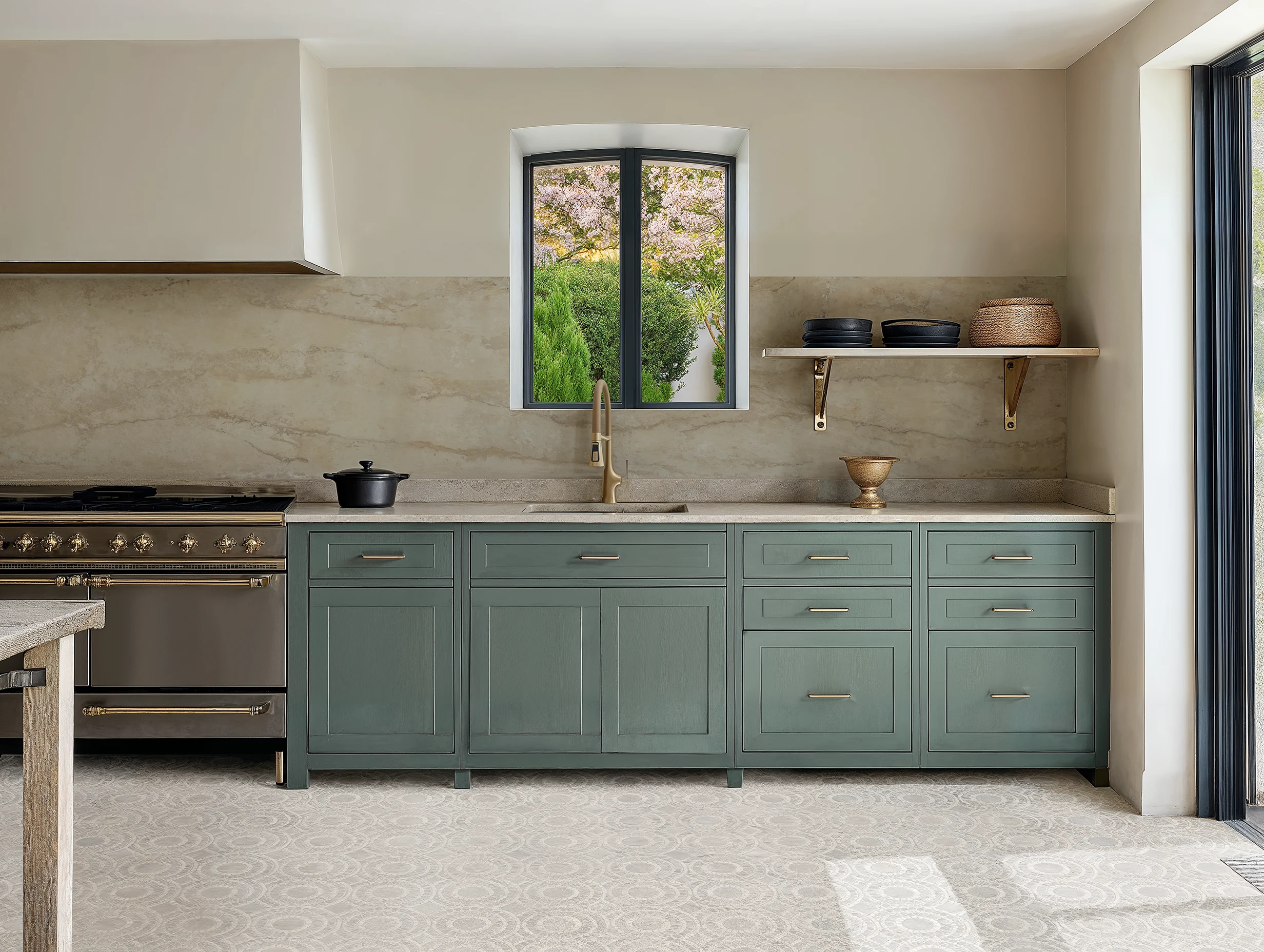 This laurel green kitchen pairs earthy painted cabinetry with creamy stone surfaces, warm brass fixtures, and a soft patterned tile floor. The layered neutrals and natural textures evoke a grounded, timeless palette.