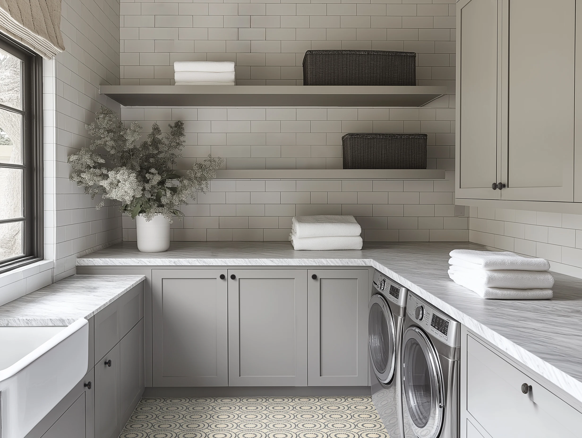 This serene laundry room features soft gray cabinetry and classic subway tile, paired with marble-inspired countertops and tile flooring. Sample this neutral palette to create this calming space.