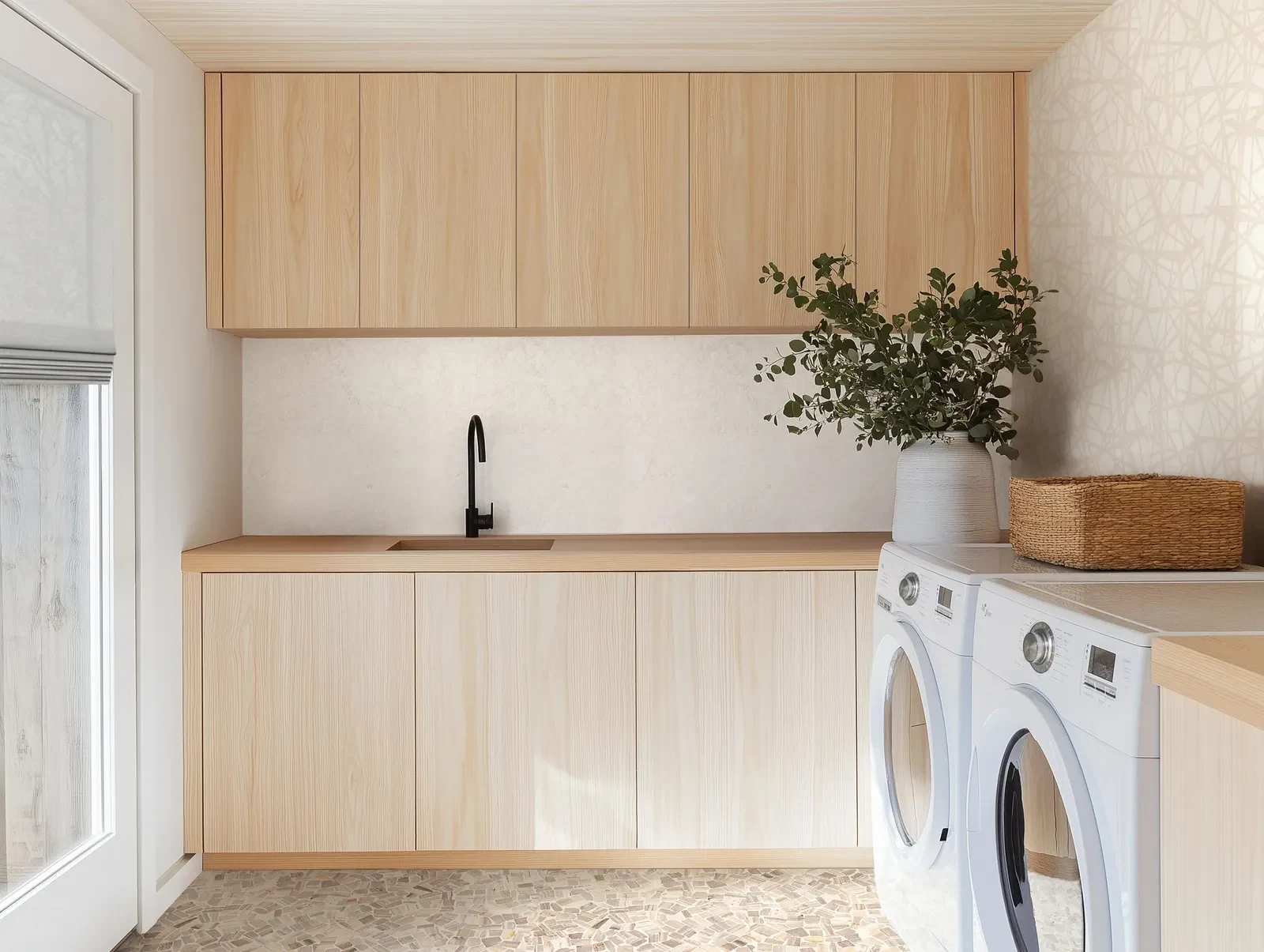 Highlighted by natural wood cabinetry and terrazzo flooring, this laundry room balances functionality with style. Explore how minimalism transforms utility spaces.
