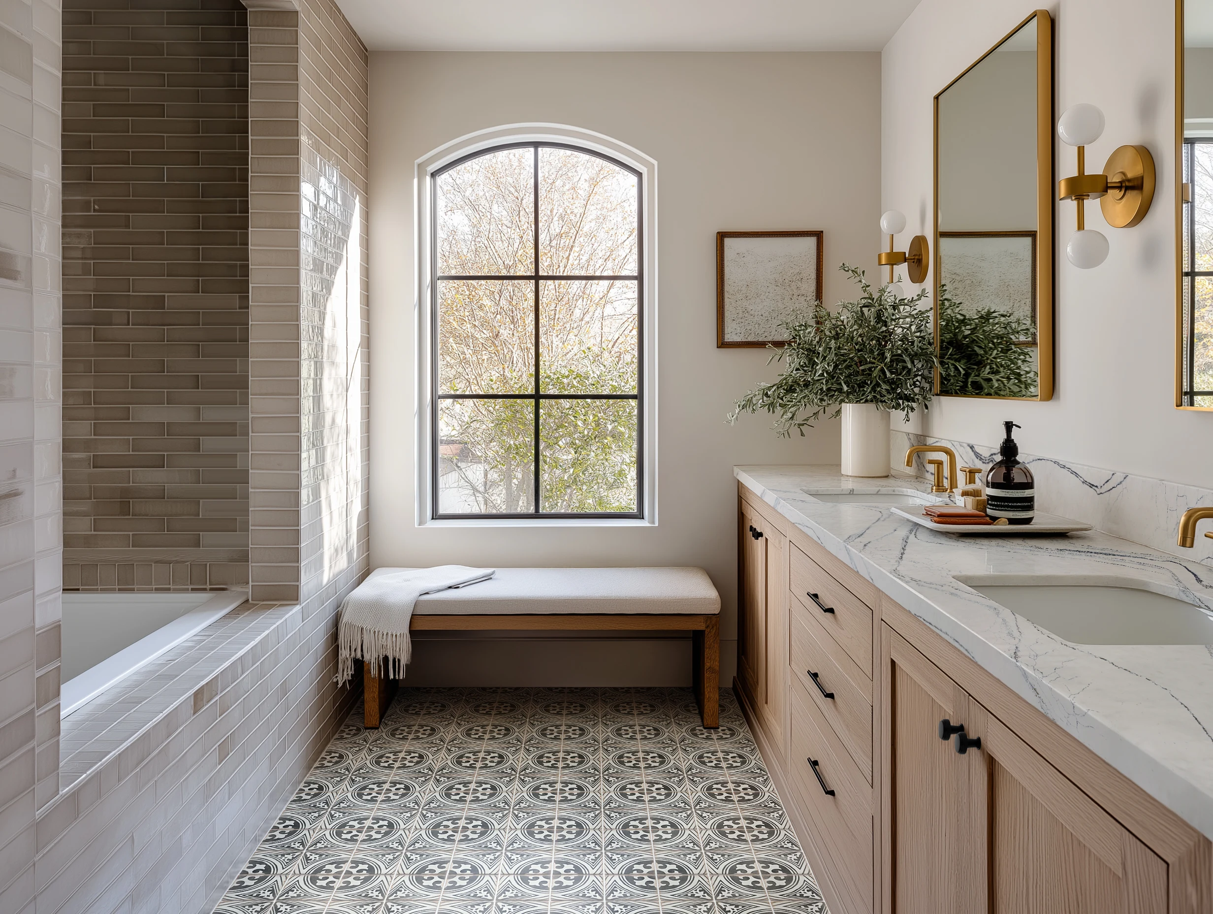 A graphic tile floor grounds this light-filled bathroom, anchored by a white oak vanity and veined marble countertop.