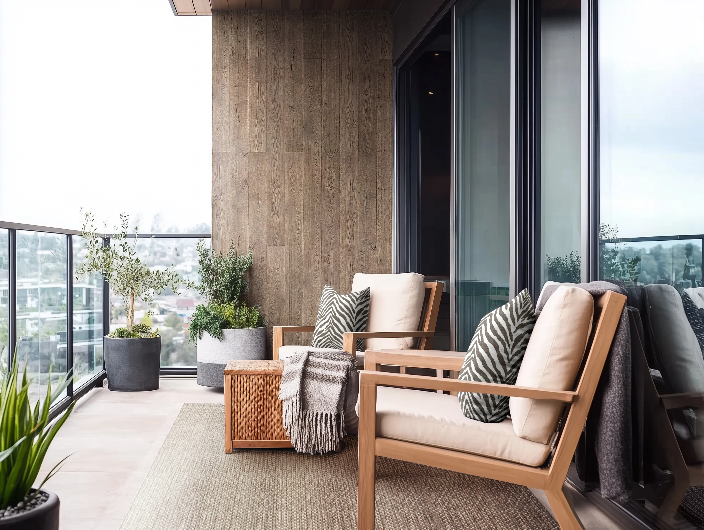 This balcony combines wood-textured paneling and neutral cushions alongside a geometric-patterned rug. Potted greenery softens the glass and metal railing, while smooth stone pavers add comfort underfoot.