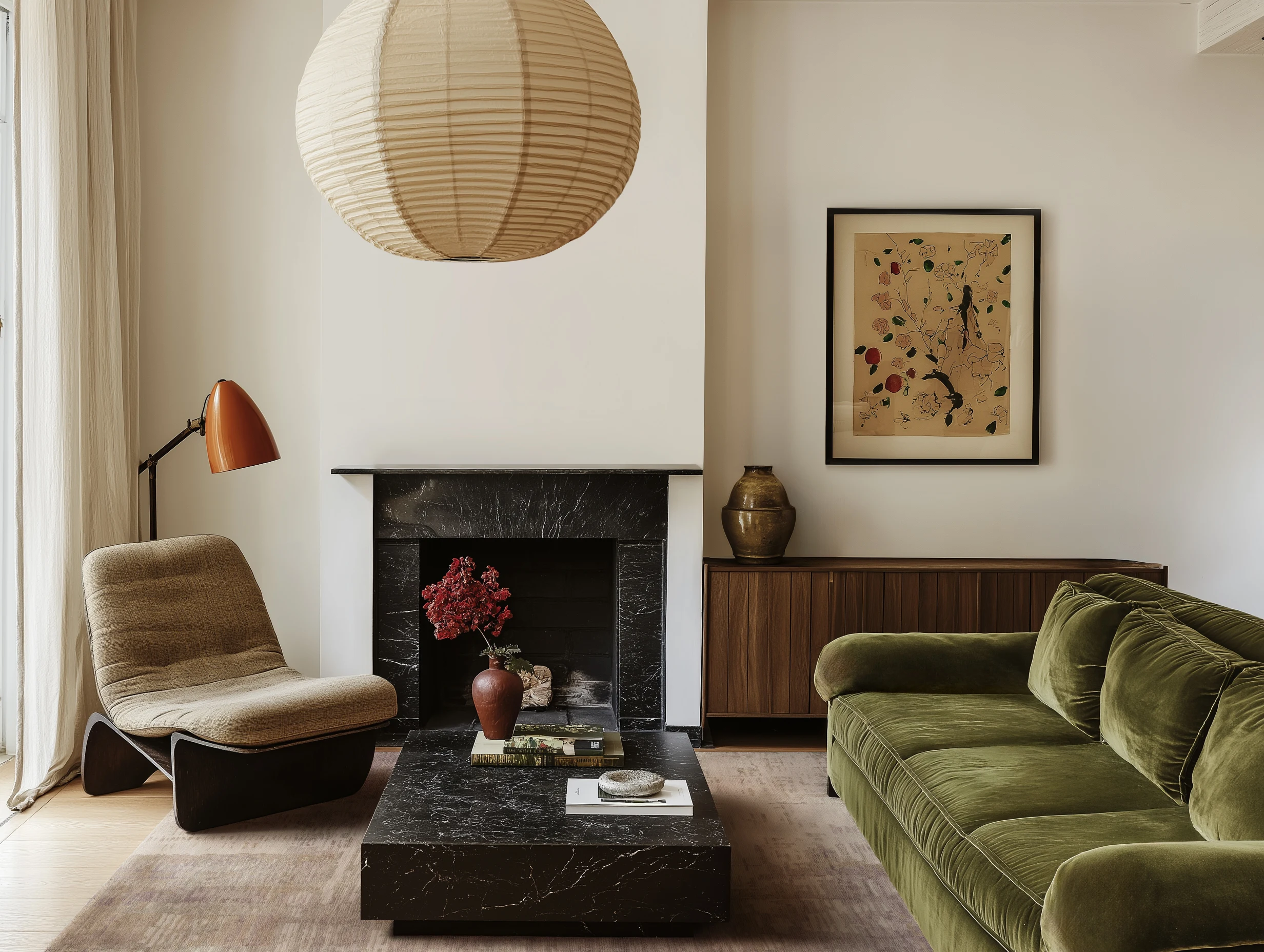 A velvet olive sofa anchors this space, with sheer drapery, a soft-toned rug, and a honed black marble fireplace complementing the natural wood floors.