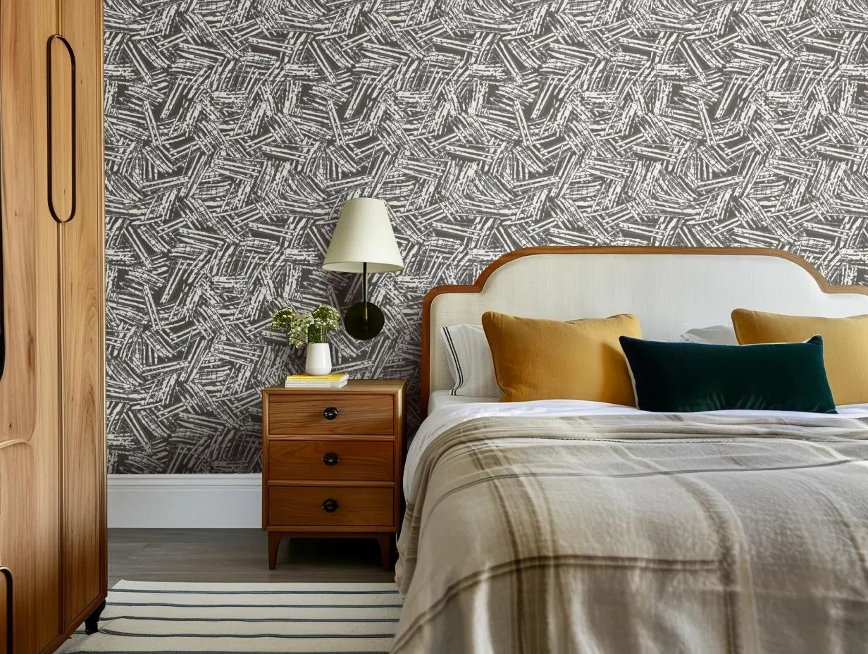 Bold patterned wallpaper pairs with grey wood floors, a cozy rug, and mustard and green velvet pillows in this bedroom retreat.