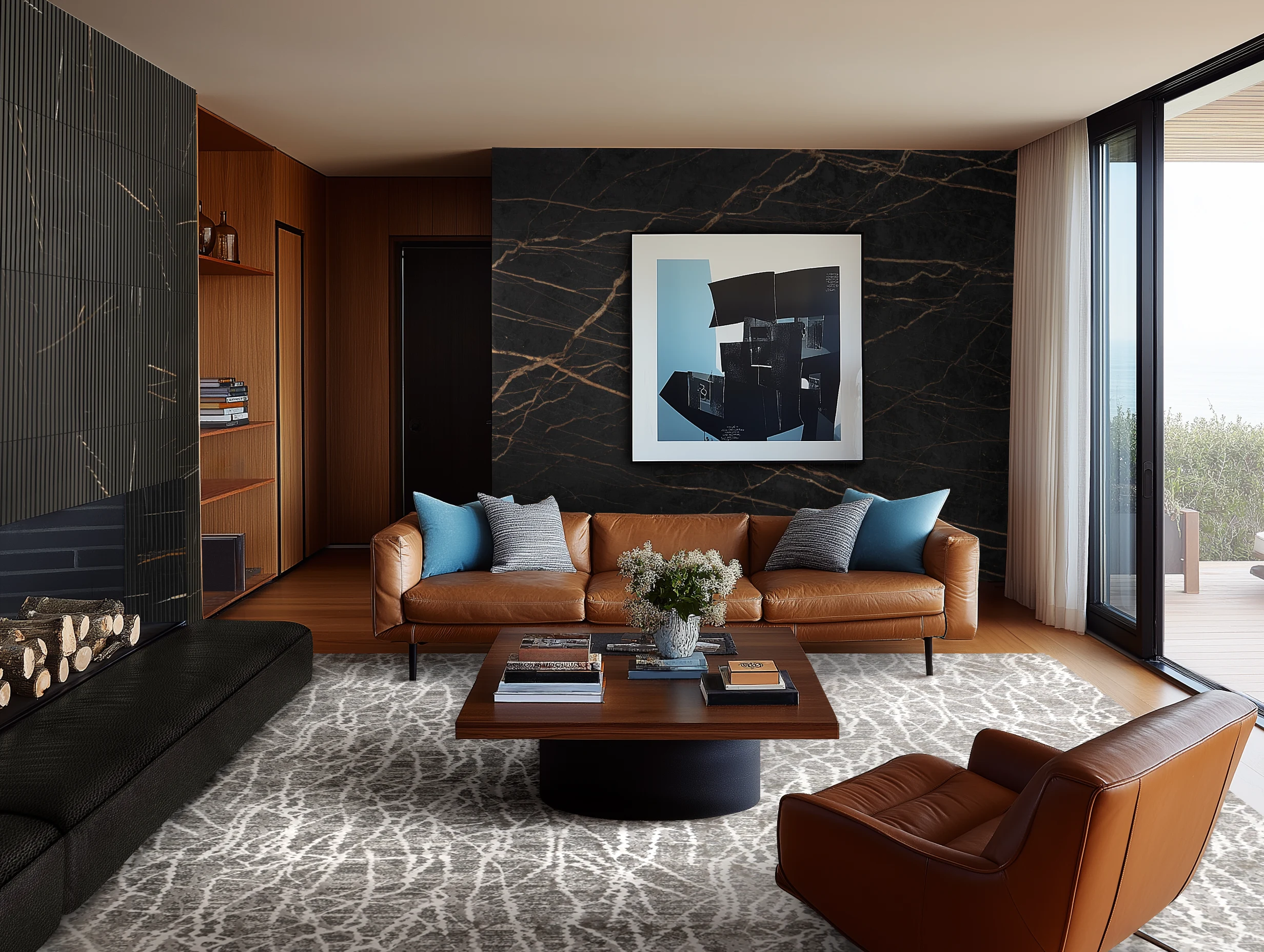 Rich black stone wall accents pair with leather upholstery and a bold rug in this warm living room. Explore these materials for an inviting, luxurious space.