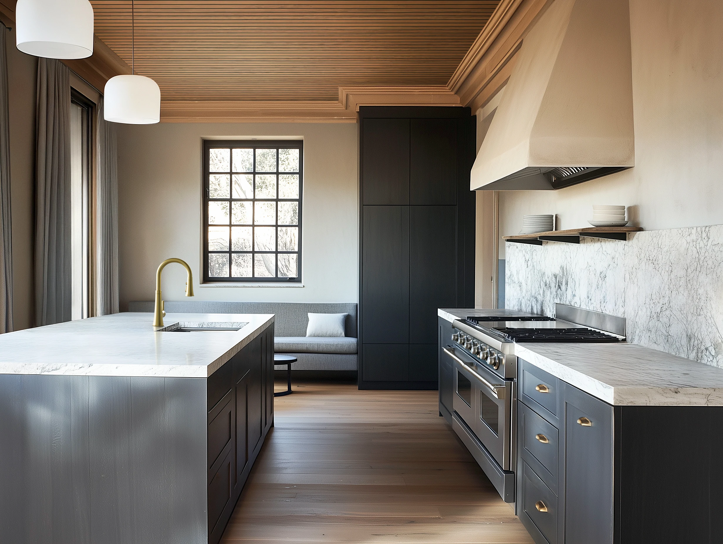 Oak ceiling paneling and light flooring contrast graphite cabinetry and marble counters, with linen drapes filtering natural light across the muted palette.